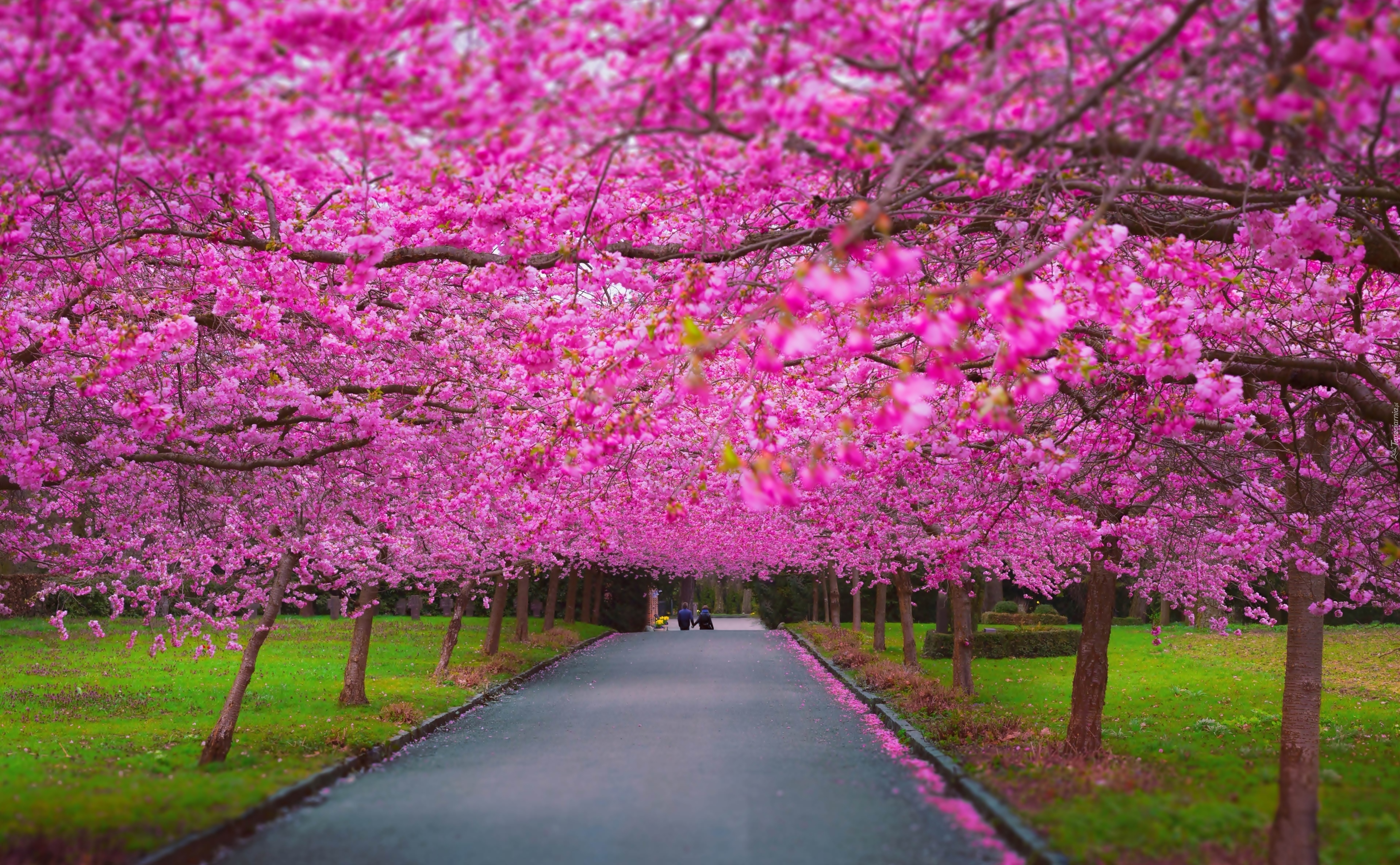 Edytor tapety: Droga w parku pośród różowo kwitnących drzew