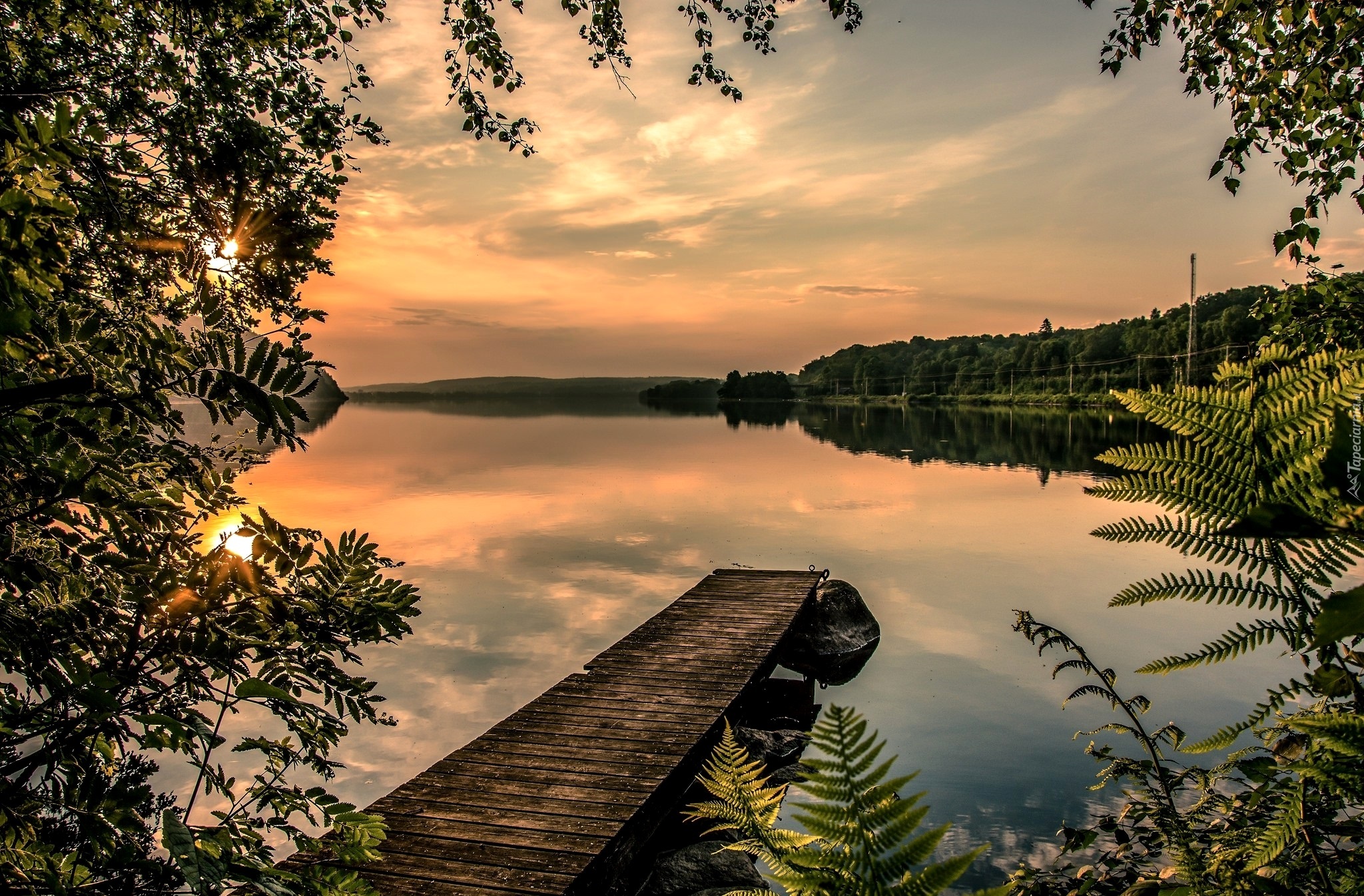 Edytor tapety: Drewniany pomost nad jeziorem o wschodzie słońca