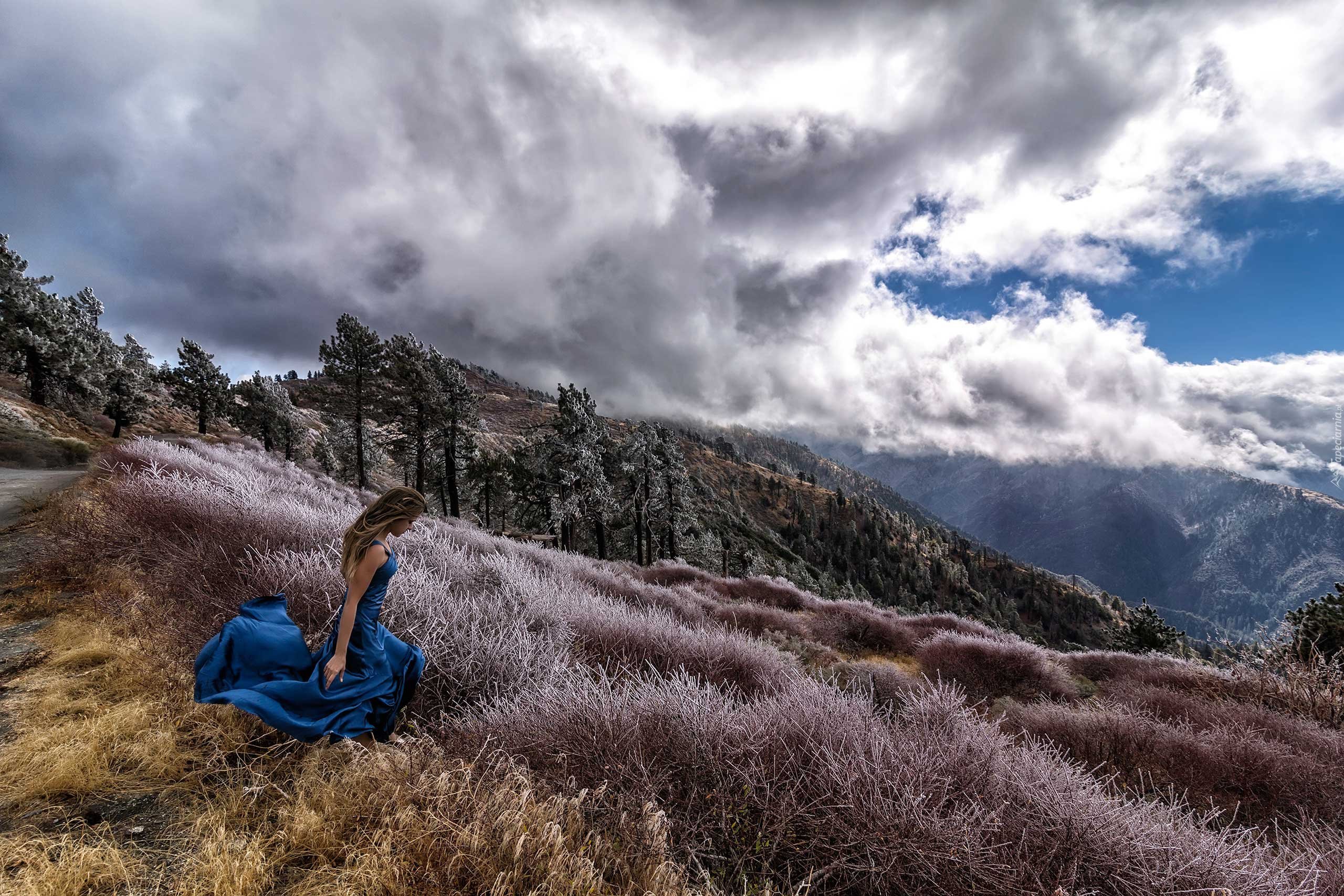 Edytor tapety: Kobieta w niebieskiej sukni spacerująca po wzgórzu