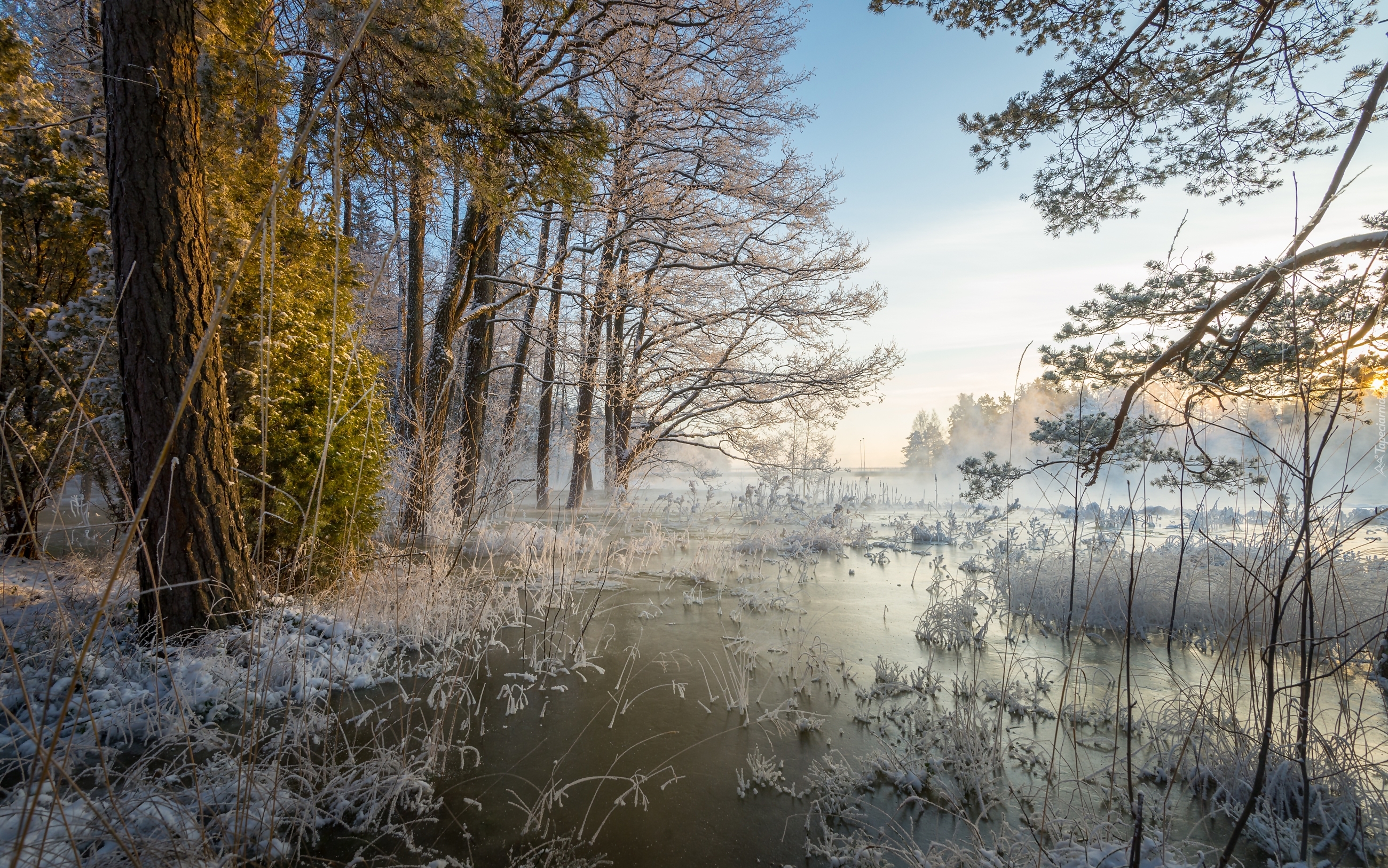 Edytor tapety: Oszronione drzewa i trawy nad jeziorem we mgle
