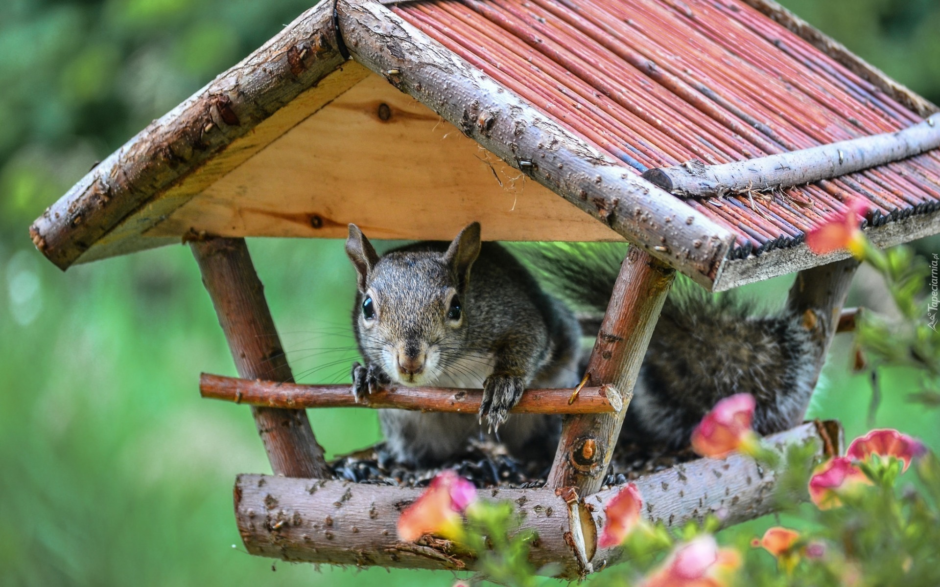 Edytor tapety: Wiewiórka w karmniku dla ptaków