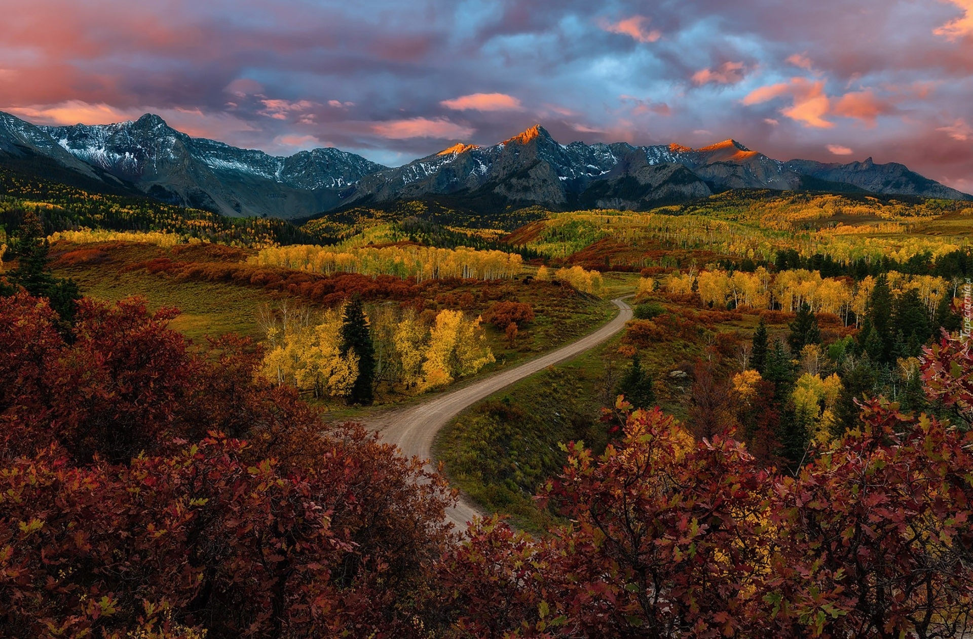 Edytor tapety: Kręta droga ku górom przez jesienne lasy