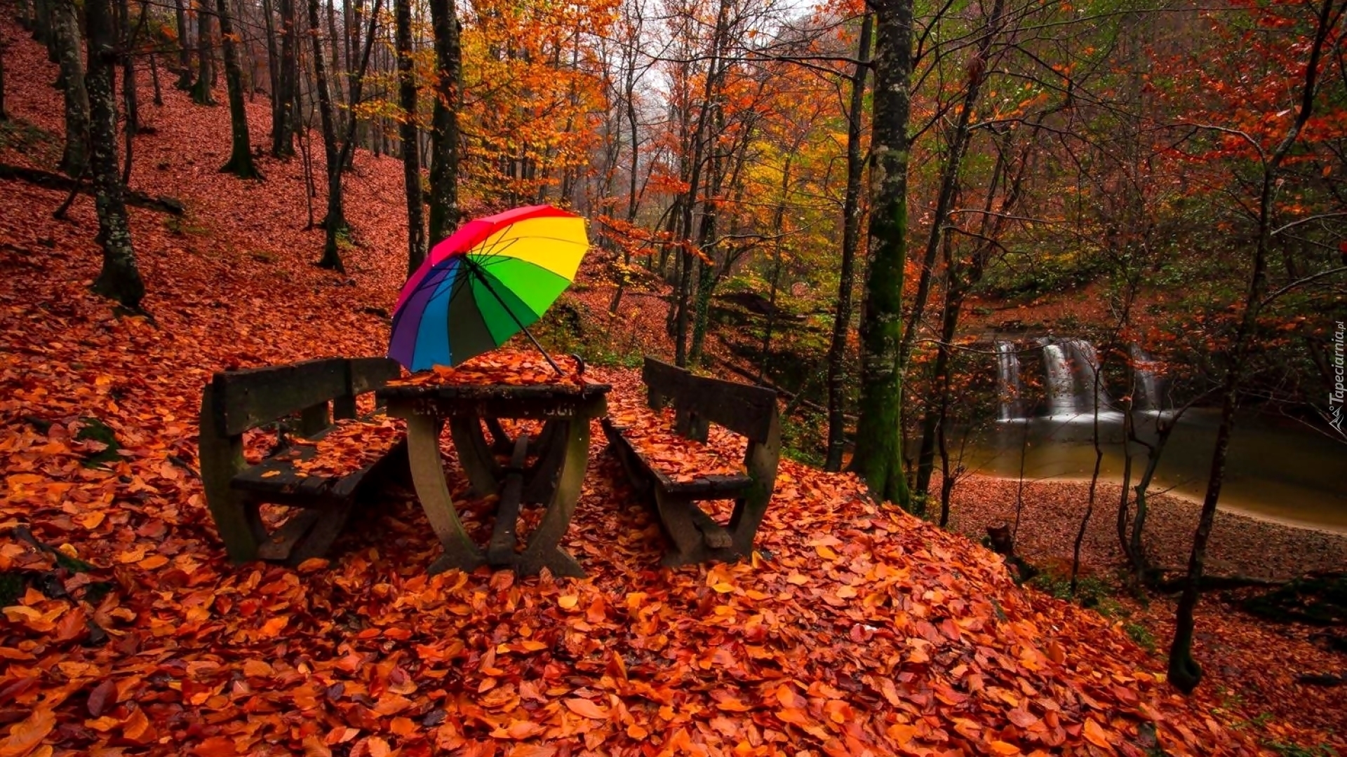 Edytor tapety: Tęczowy parasol na ławce w jesiennym lesie