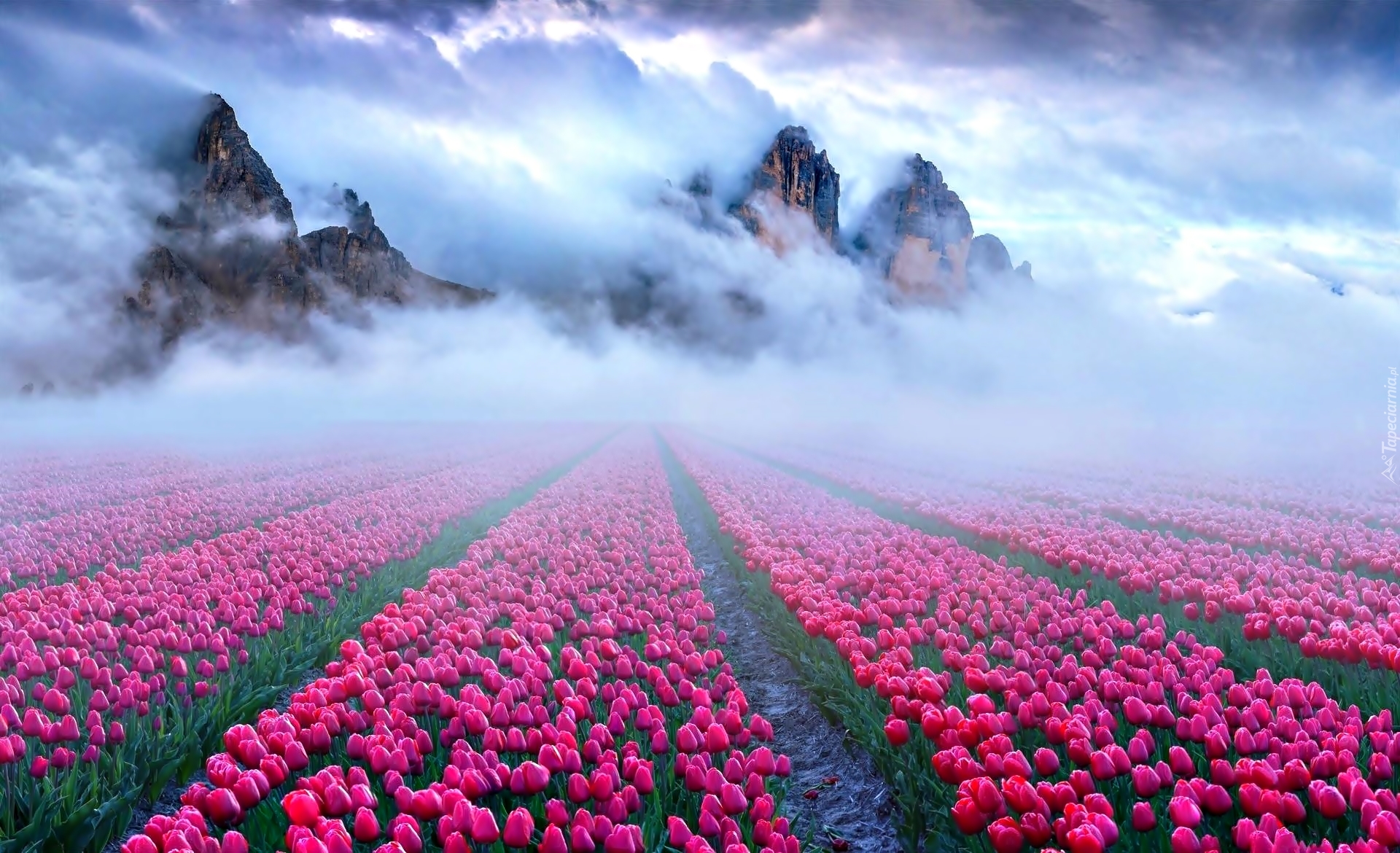 Edytor tapety: Mglisty świt nad polem tulipanów