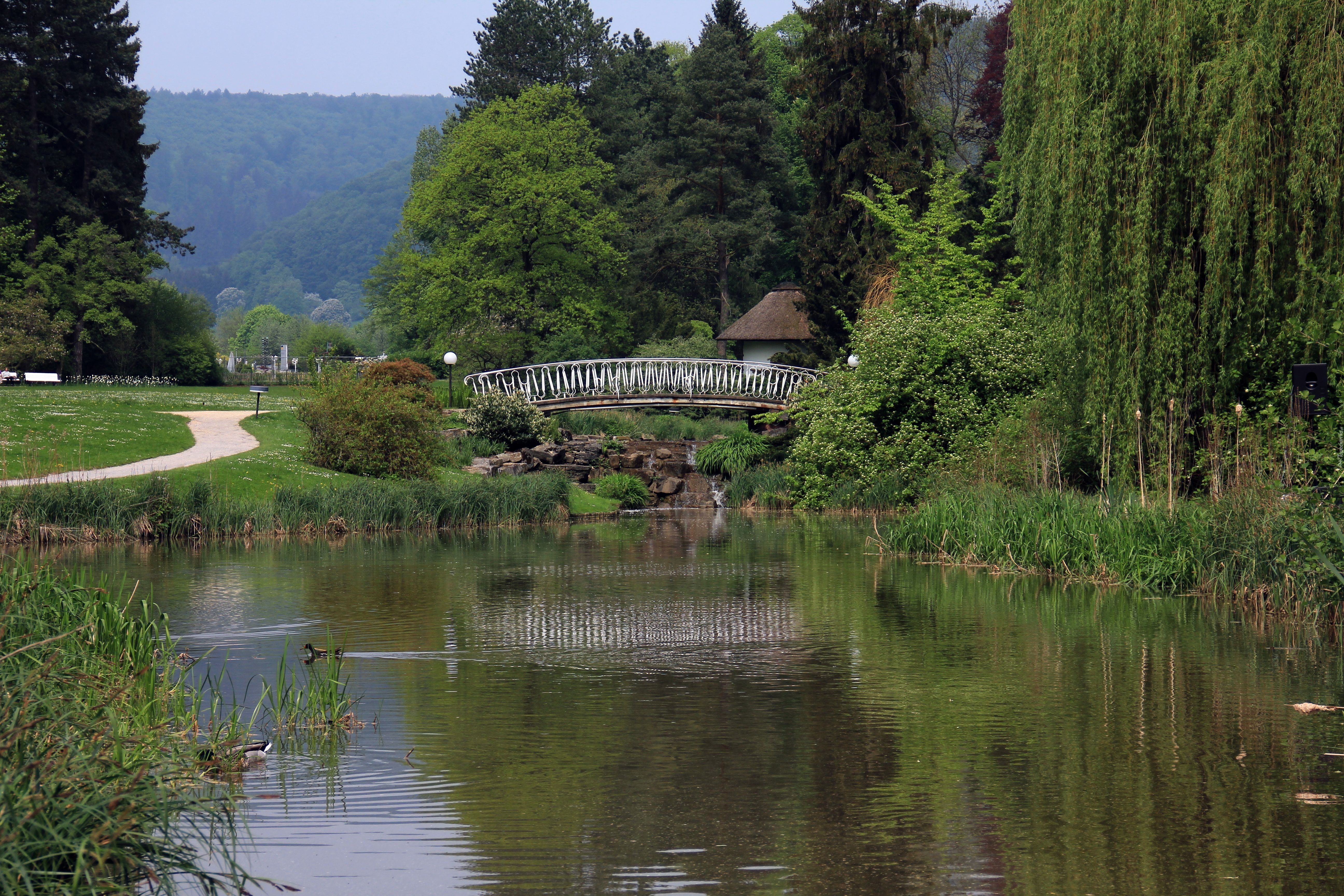 Edytor tapety: Mostek nad stawem w parku