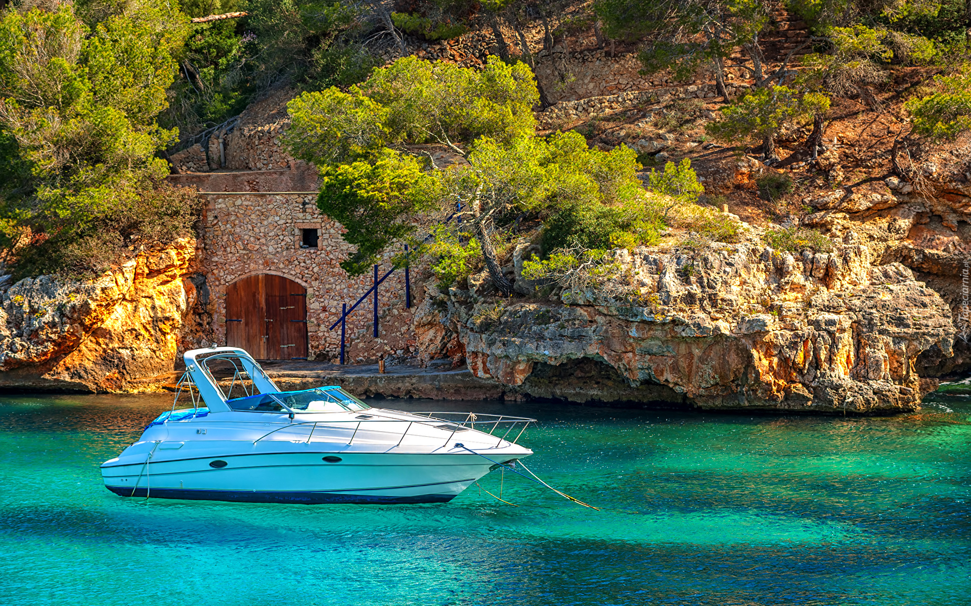 Edytor tapety: Motorówka przy skale