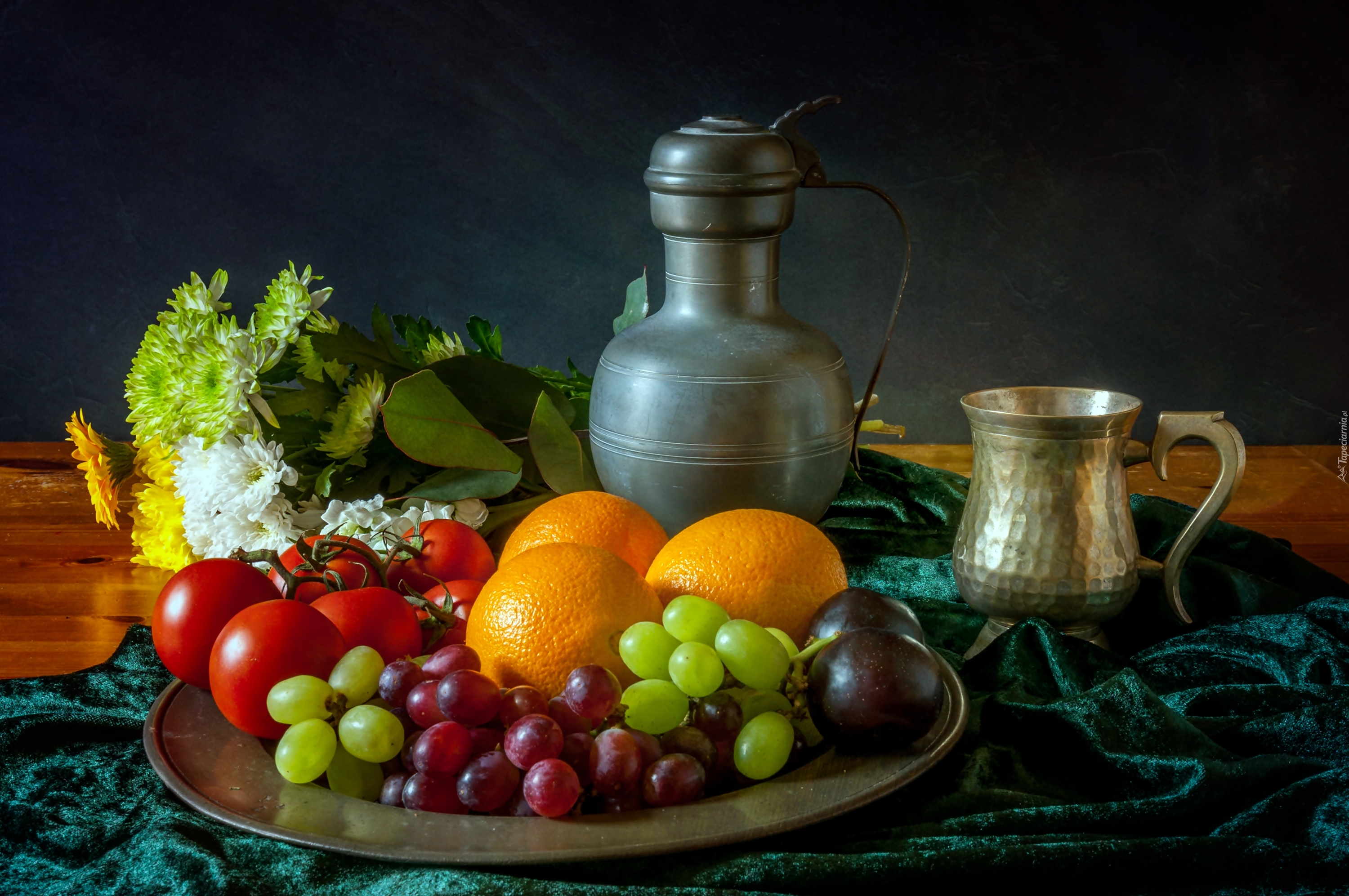 Edytor tapety: Kompozycja owocowo warzywna z kwiatami i dzbankiem