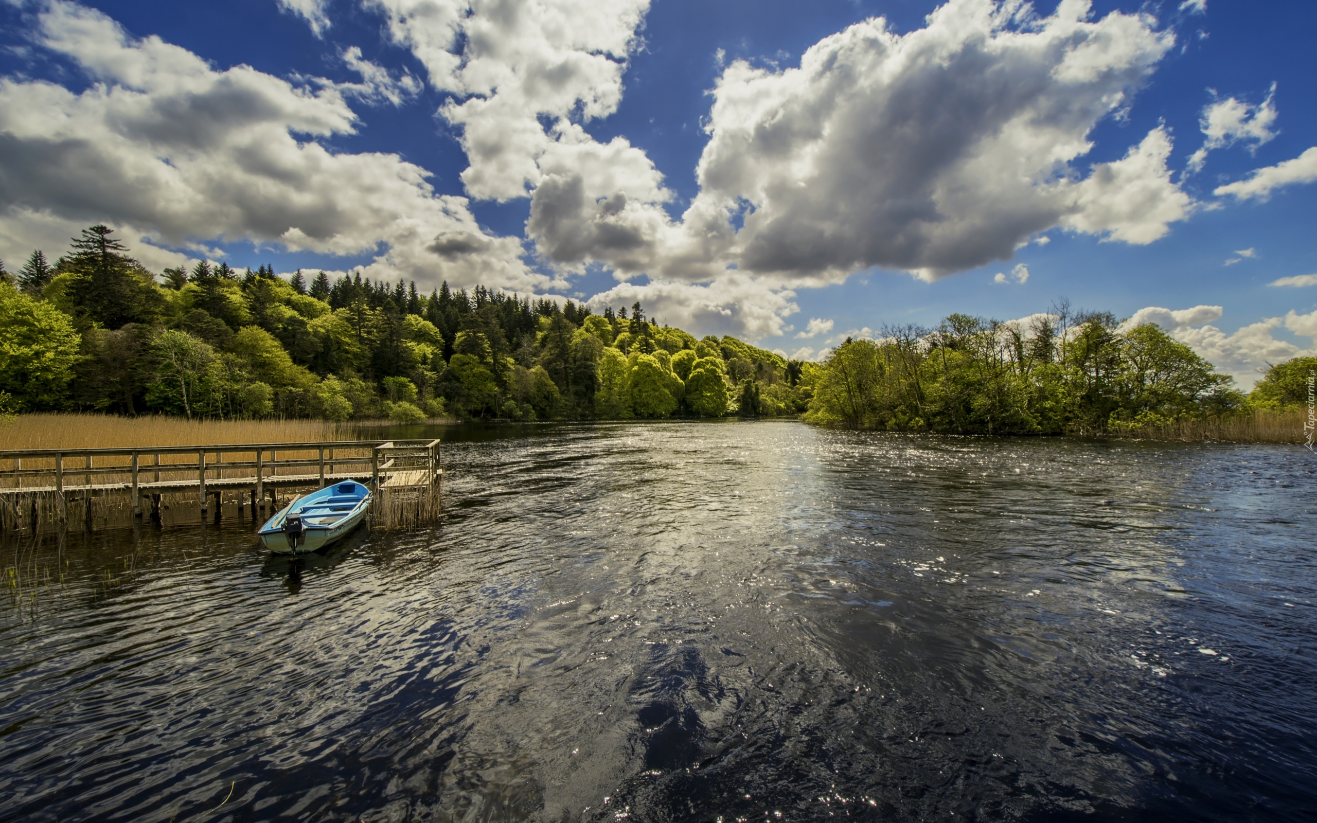 Edytor tapety: Jezioro w lesie z pomostem i łódką