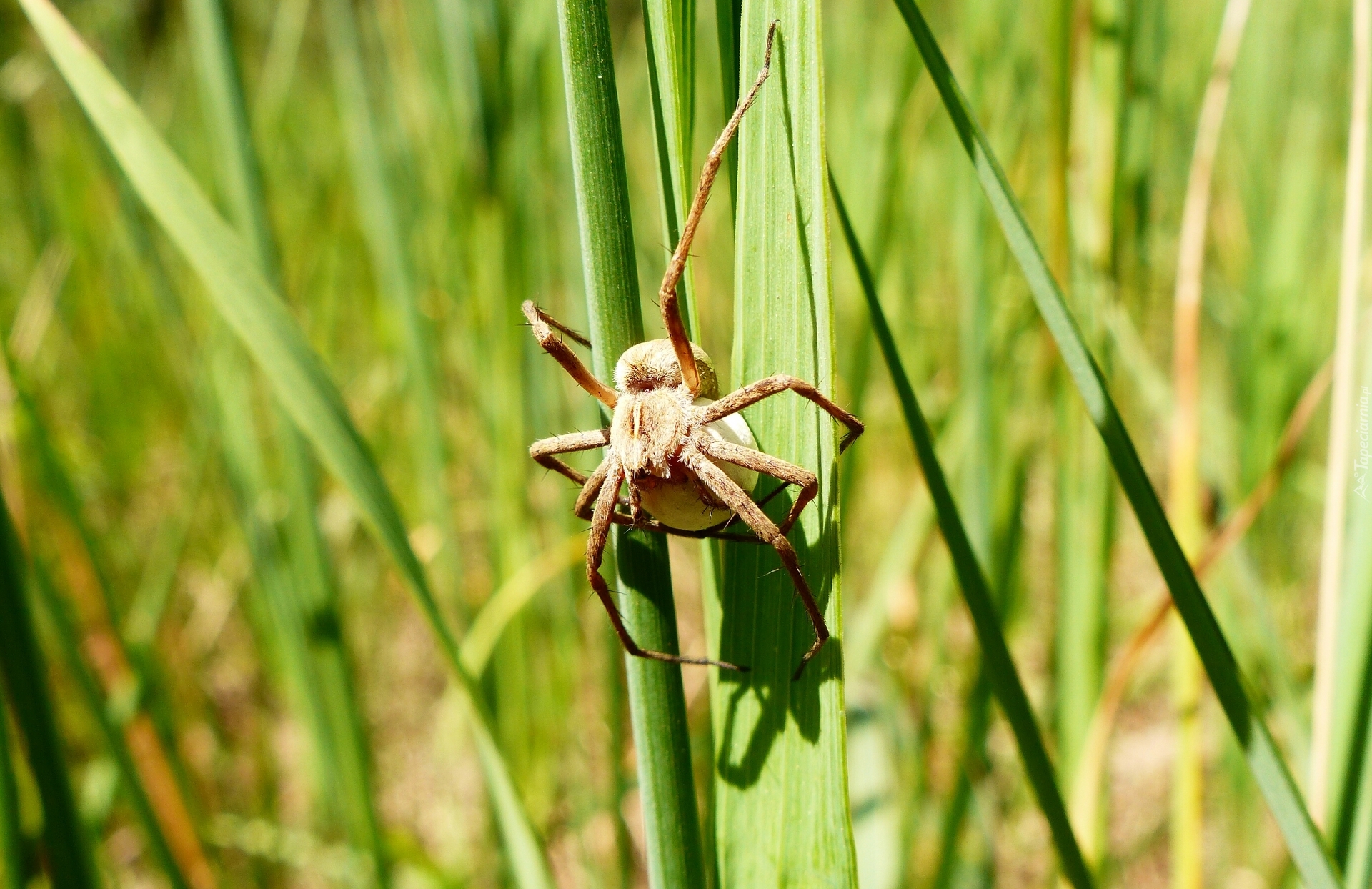 Edytor tapety: Pająk darownik przedziwny wspina się po trawie