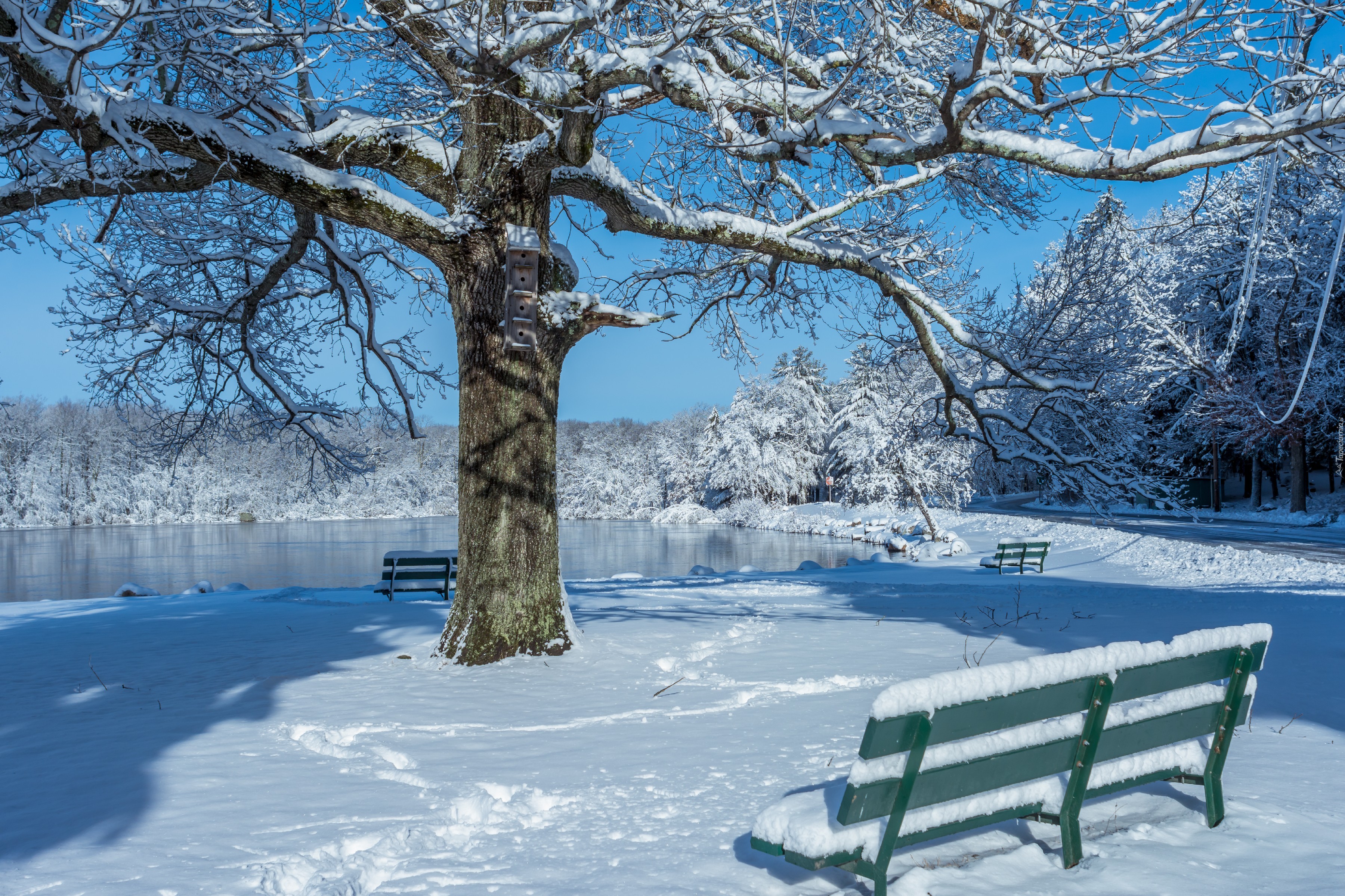 Edytor tapety: Park ze stawem i ławeczkami w zimowej odsłonie