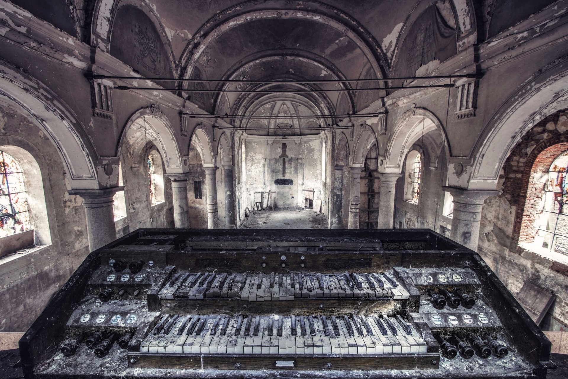 Edytor tapety: Ruiny kościoła i zniszczone organy