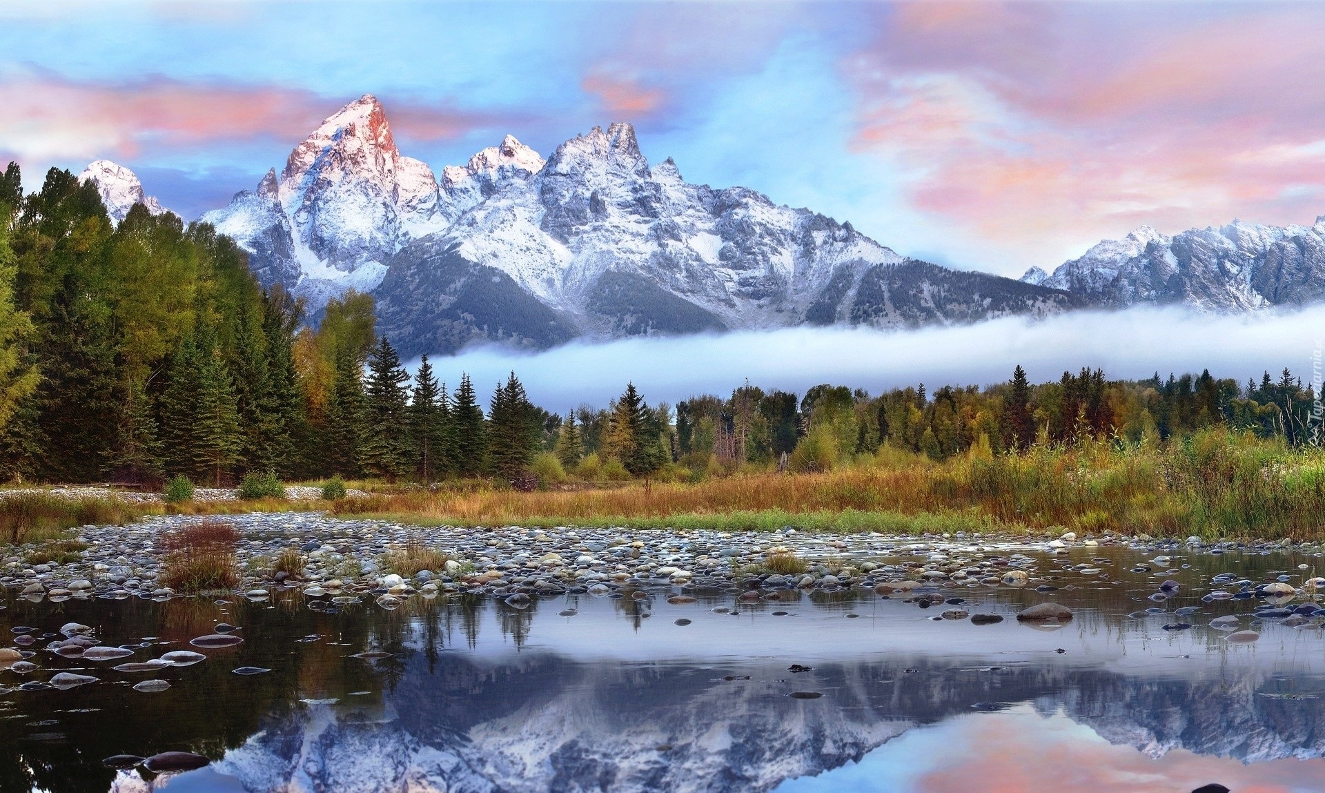 Edytor tapety: Zamglone góry, las i kamienista rzeka