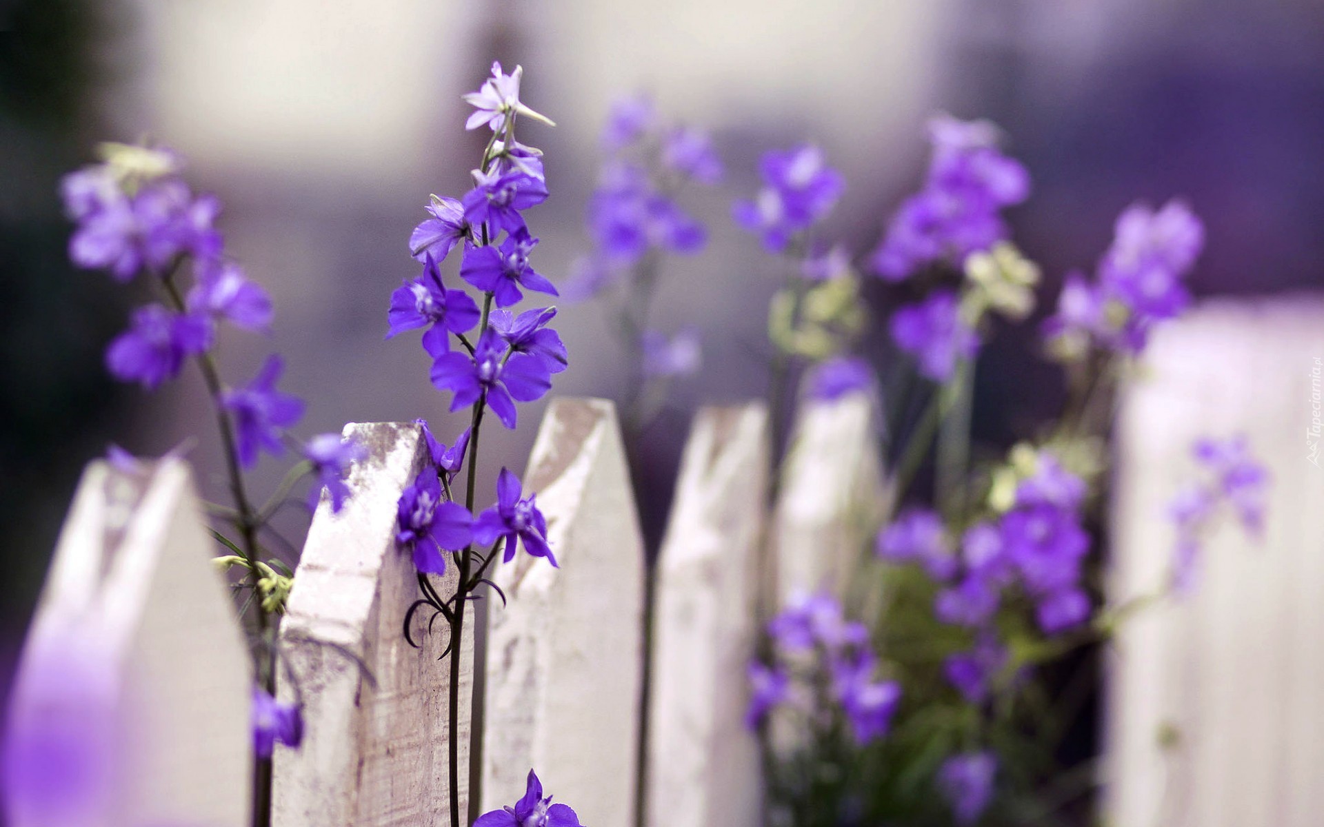 Edytor tapety: Fioletowe kwiatki ozdobą białego płotu