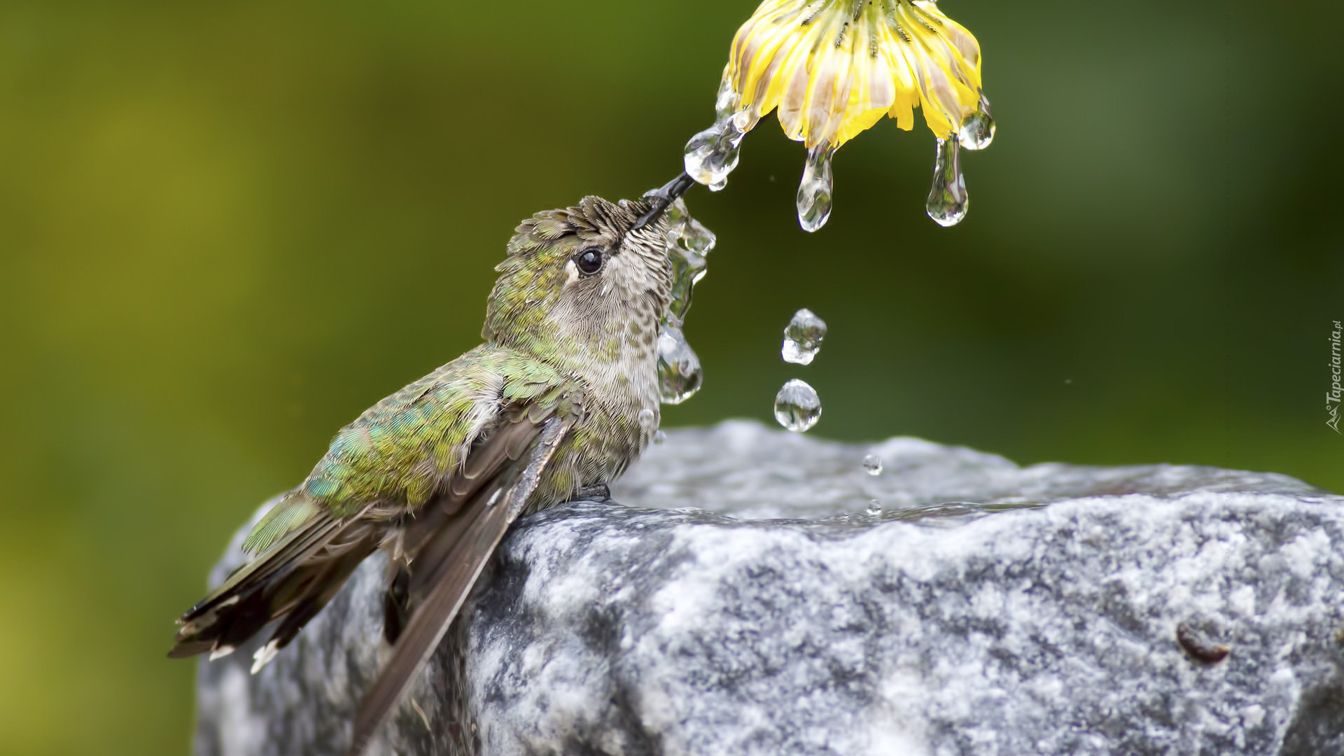 Edytor tapety: Spragniony koliber pije wodę z kwiatka