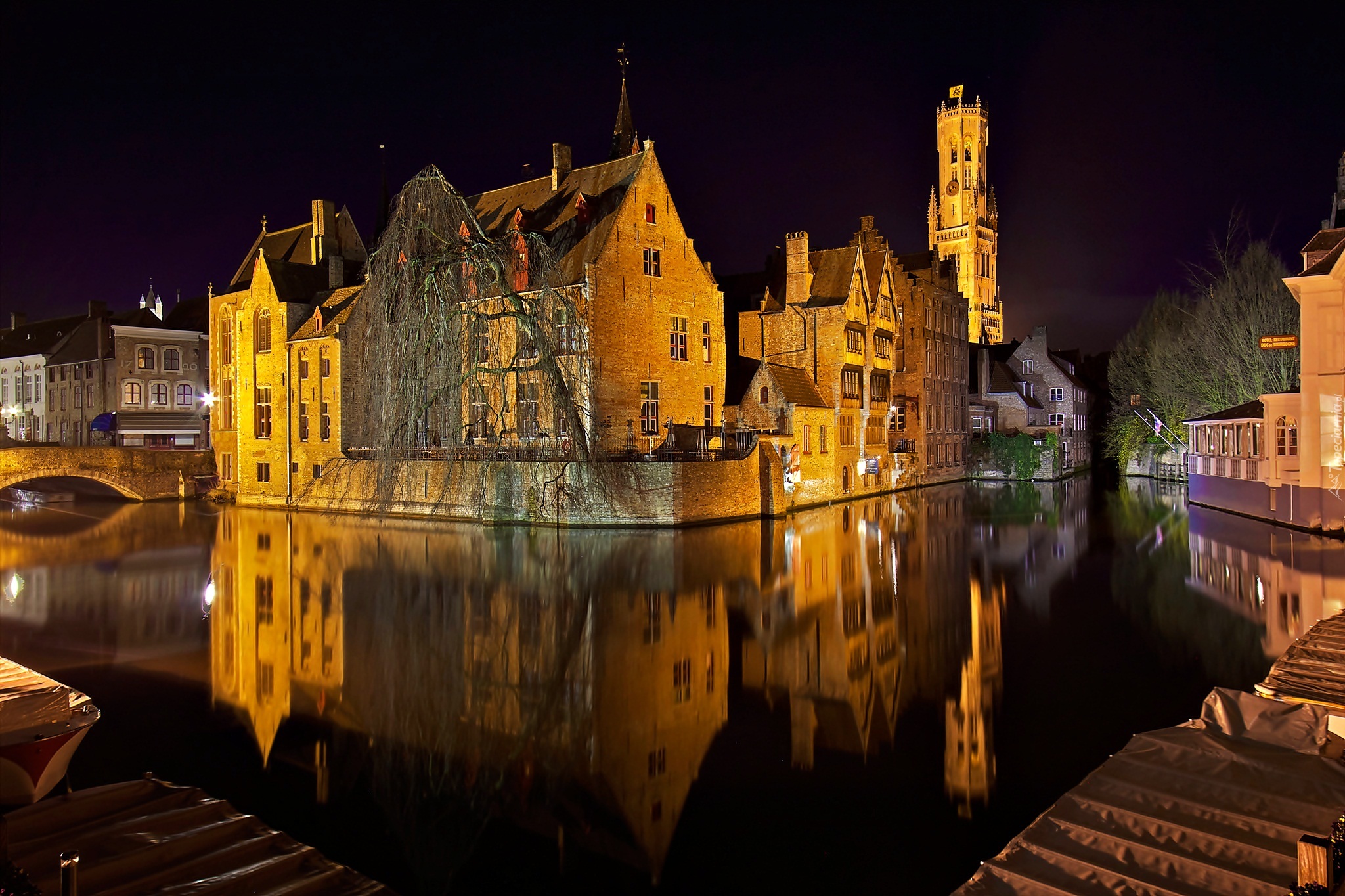 Edytor tapety: Domy nad kanałem w belgijskiej Brugii nocą