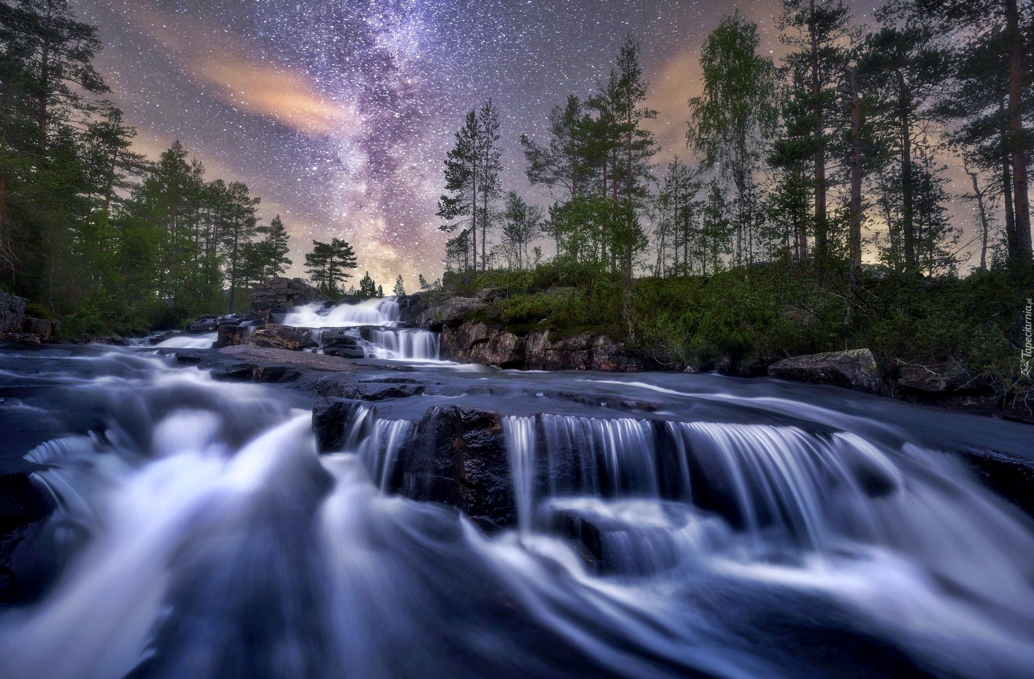 Edytor tapety: Skalny wodospad w otoczeniu drzew