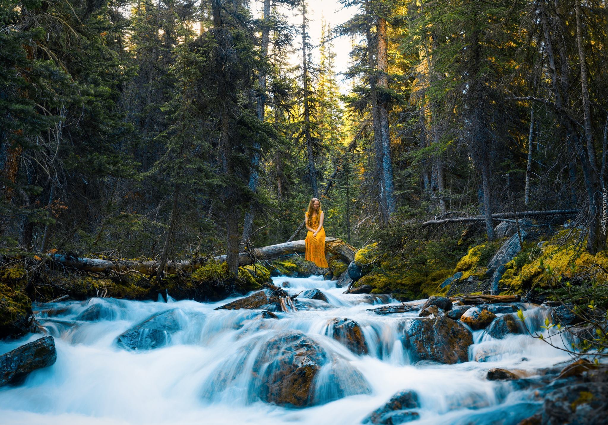 Edytor tapety: Kobieta siedziąca na zwalonym drzewie w lesie