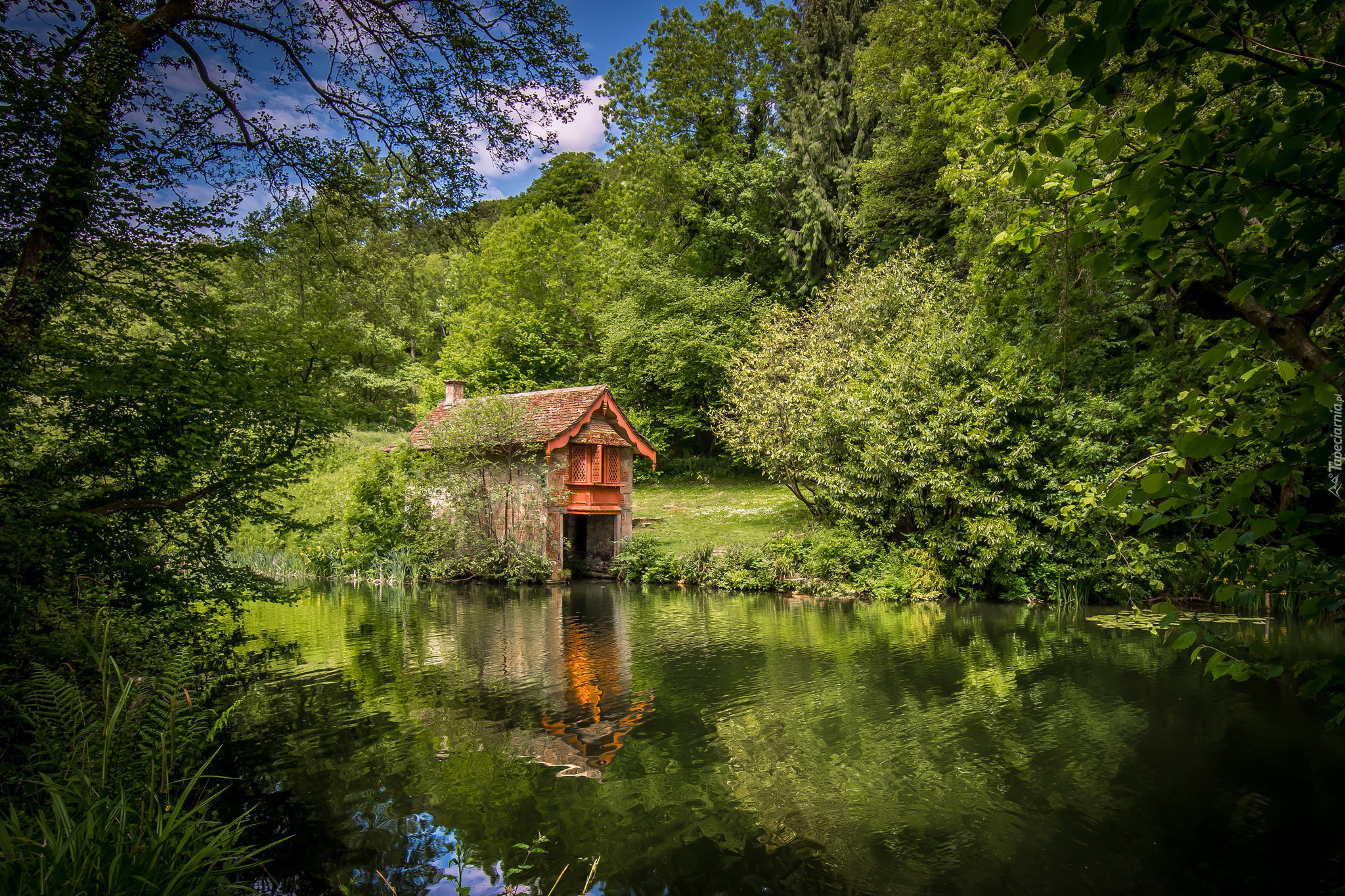 Edytor tapety: Mały budynek nad rzeką w otoczenniu drzew