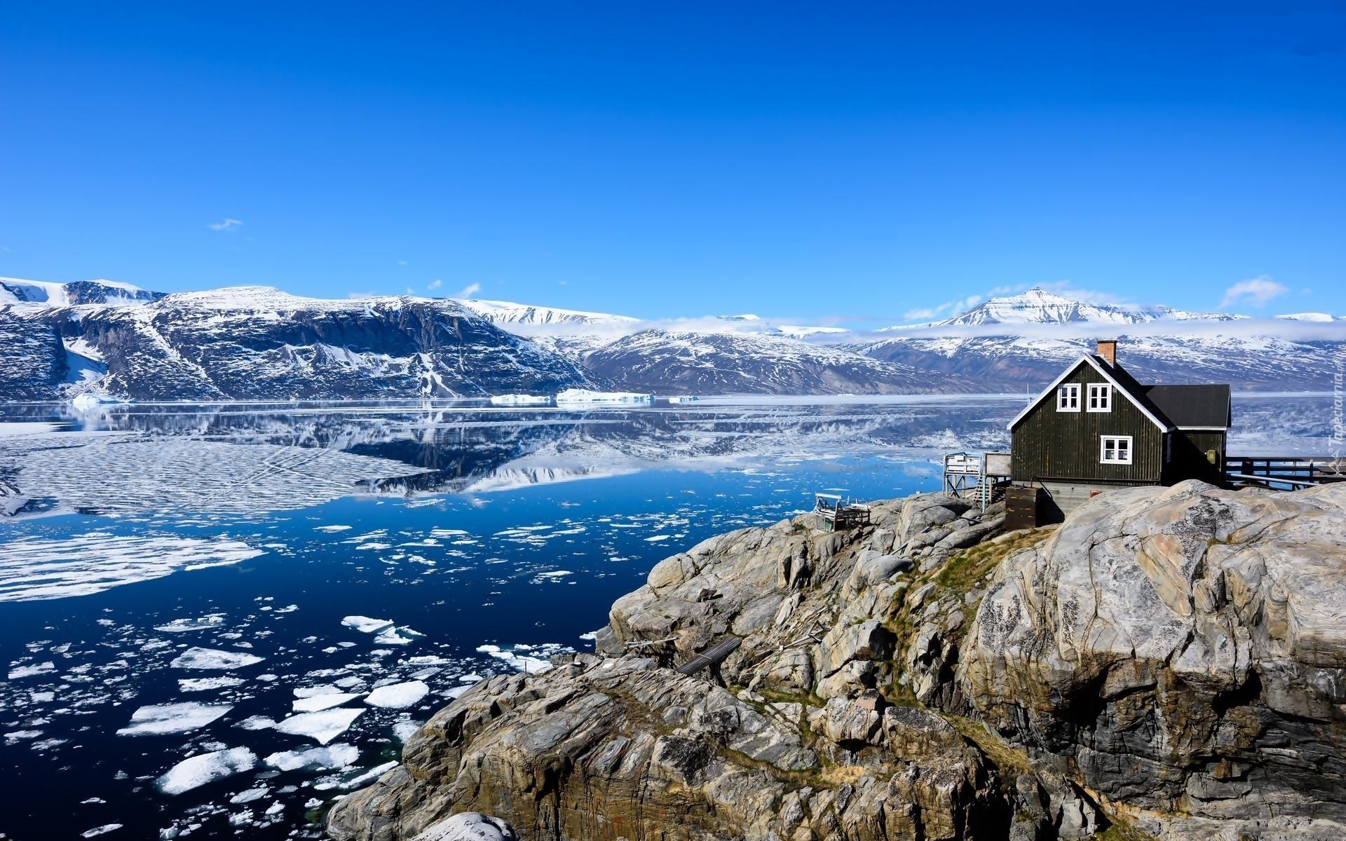 Edytor tapety: Dom na skale w Grenlandii otoczony górska rzeką