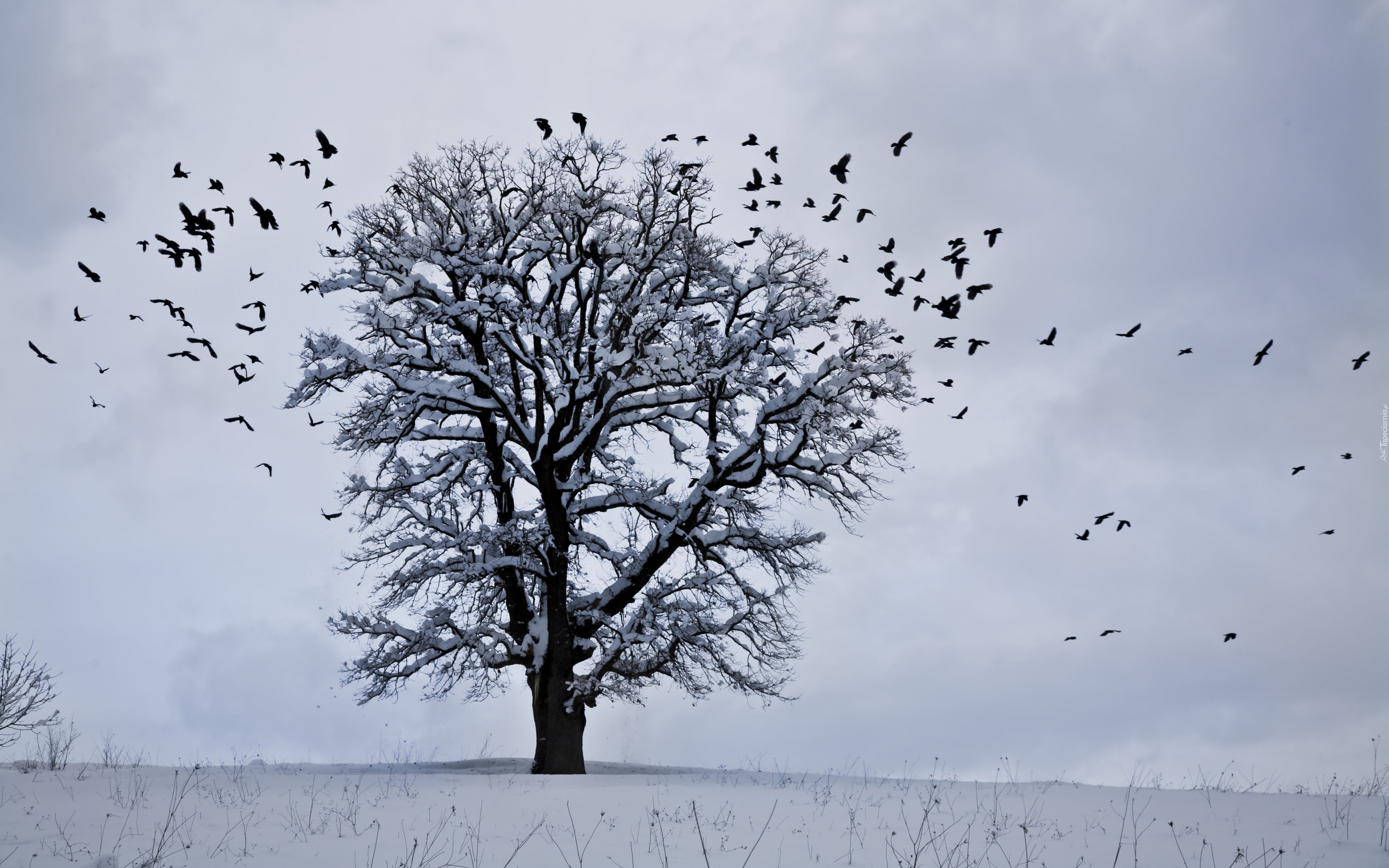 Edytor tapety: Ptaki nad drzewem w zimowej bieli