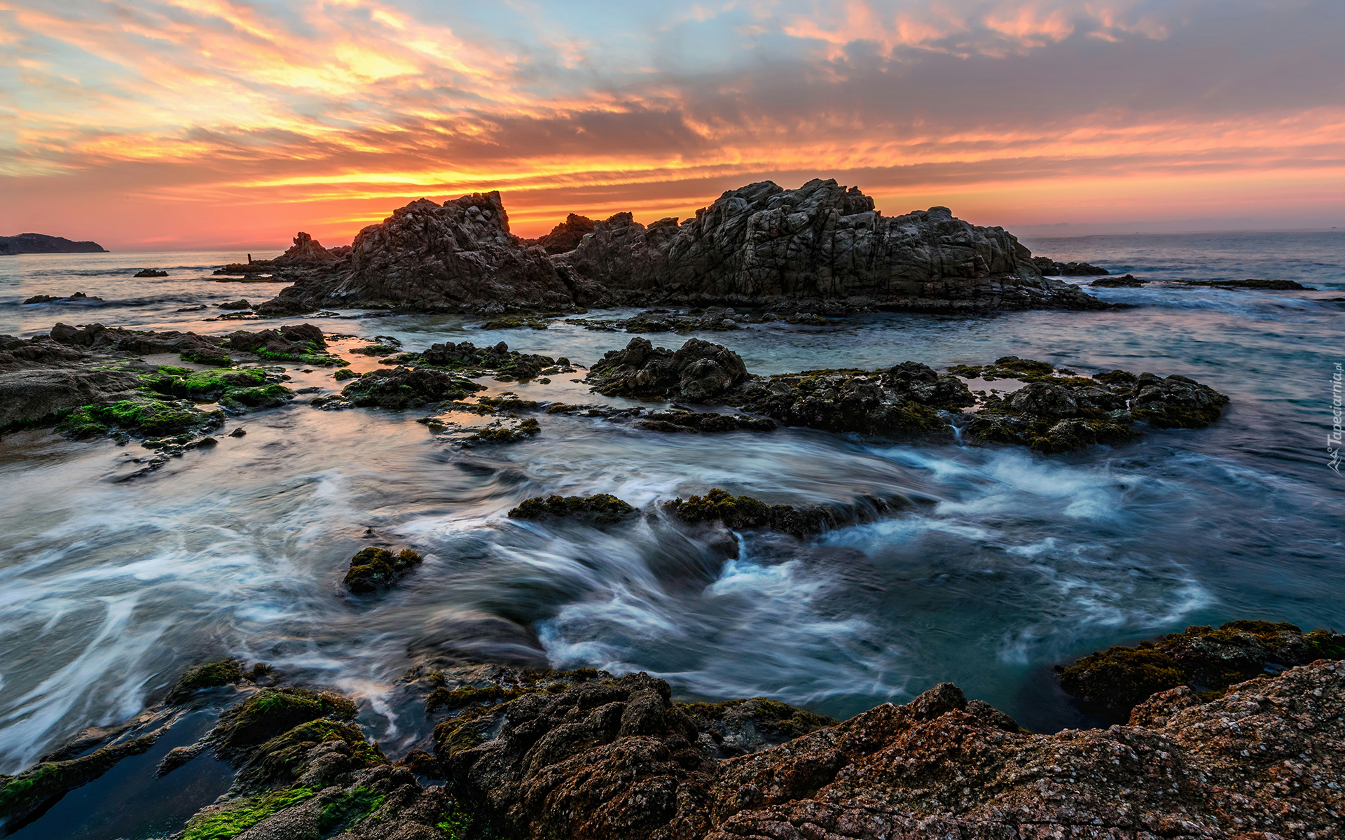 Edytor tapety: Morskie skały i kolorowy zachód słońca