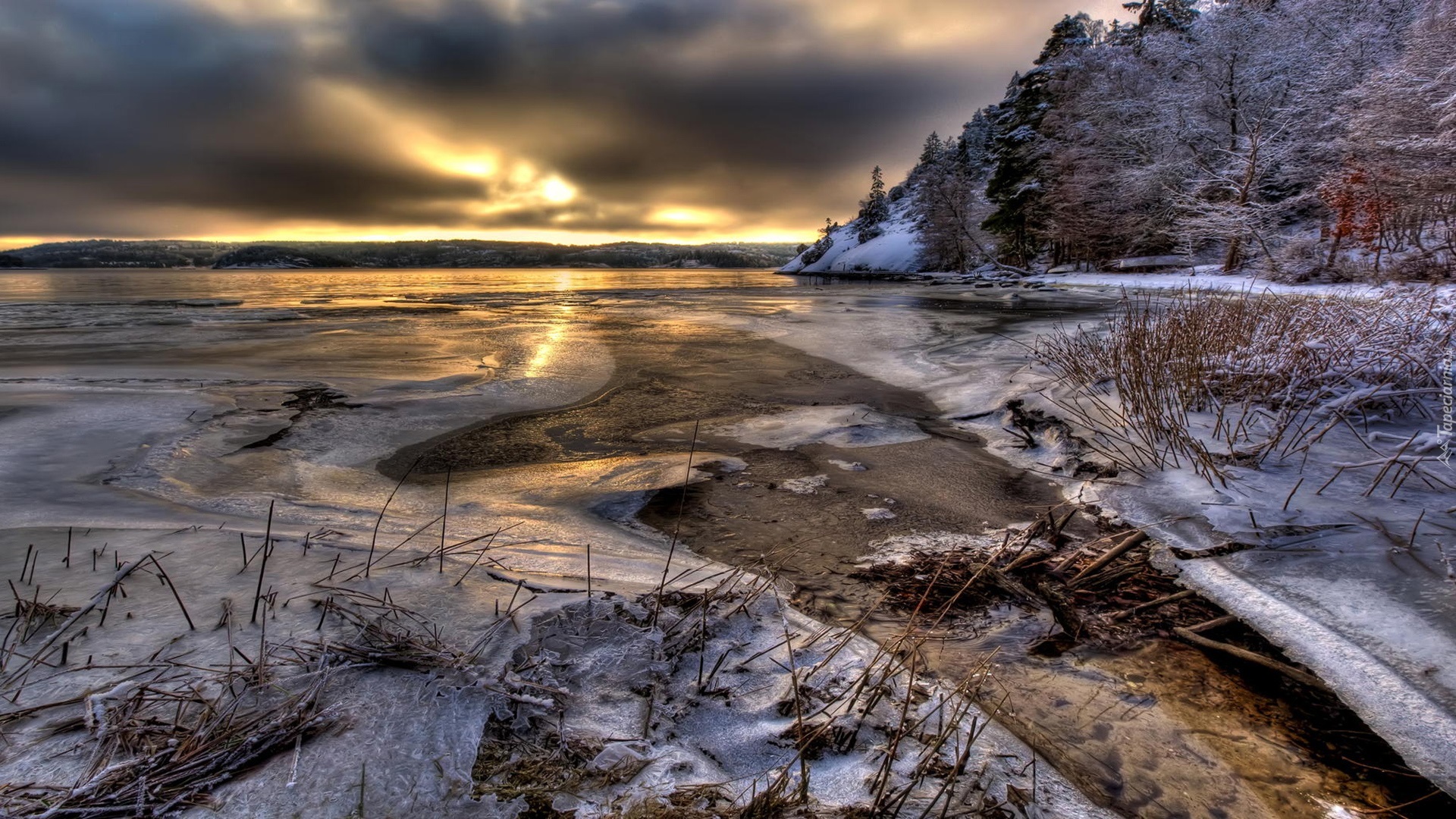 Edytor tapety: Wybrzeże zimą o zachodzie słońca
