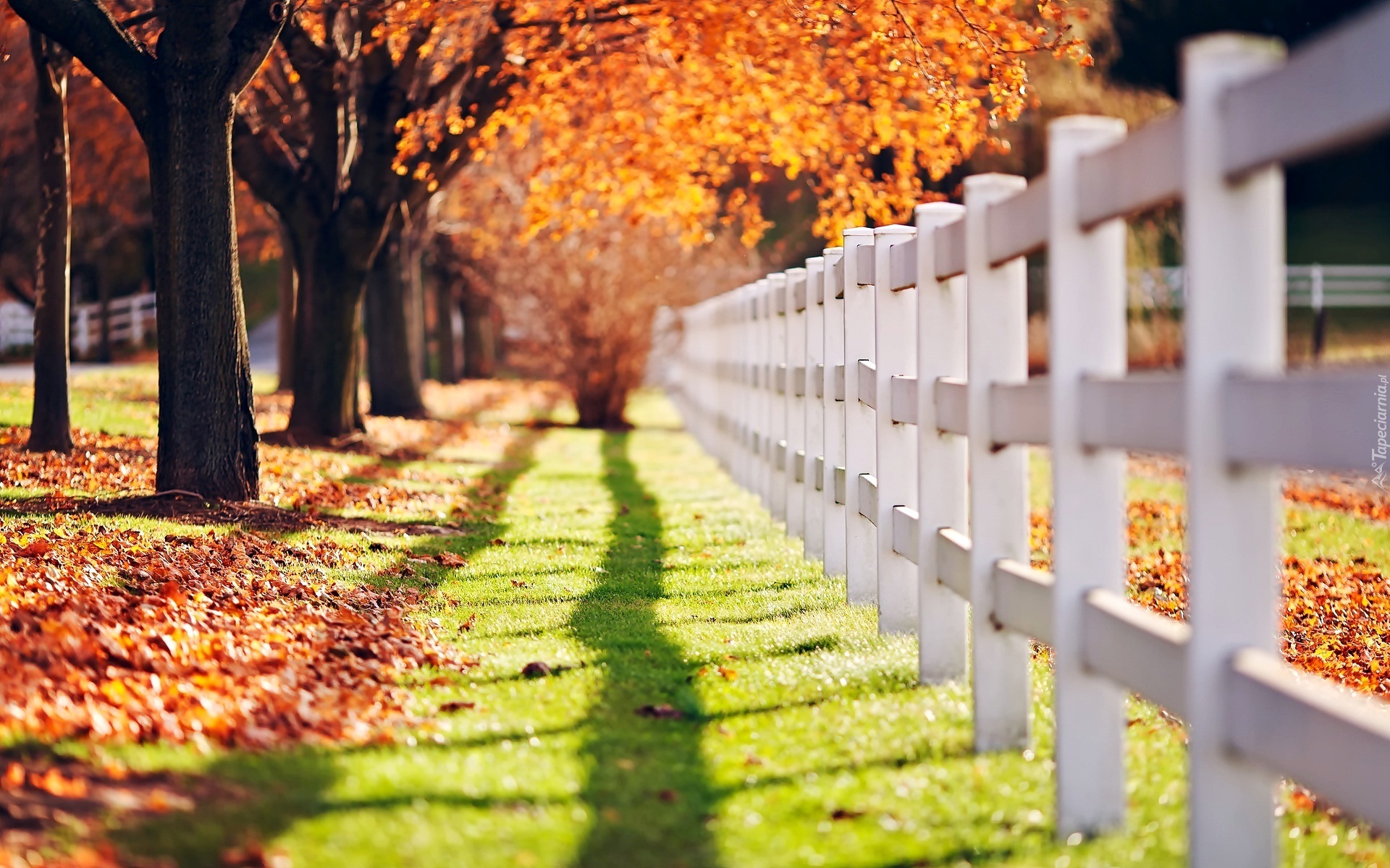 Edytor tapety: Jesienny park ogrodzony białym płotem