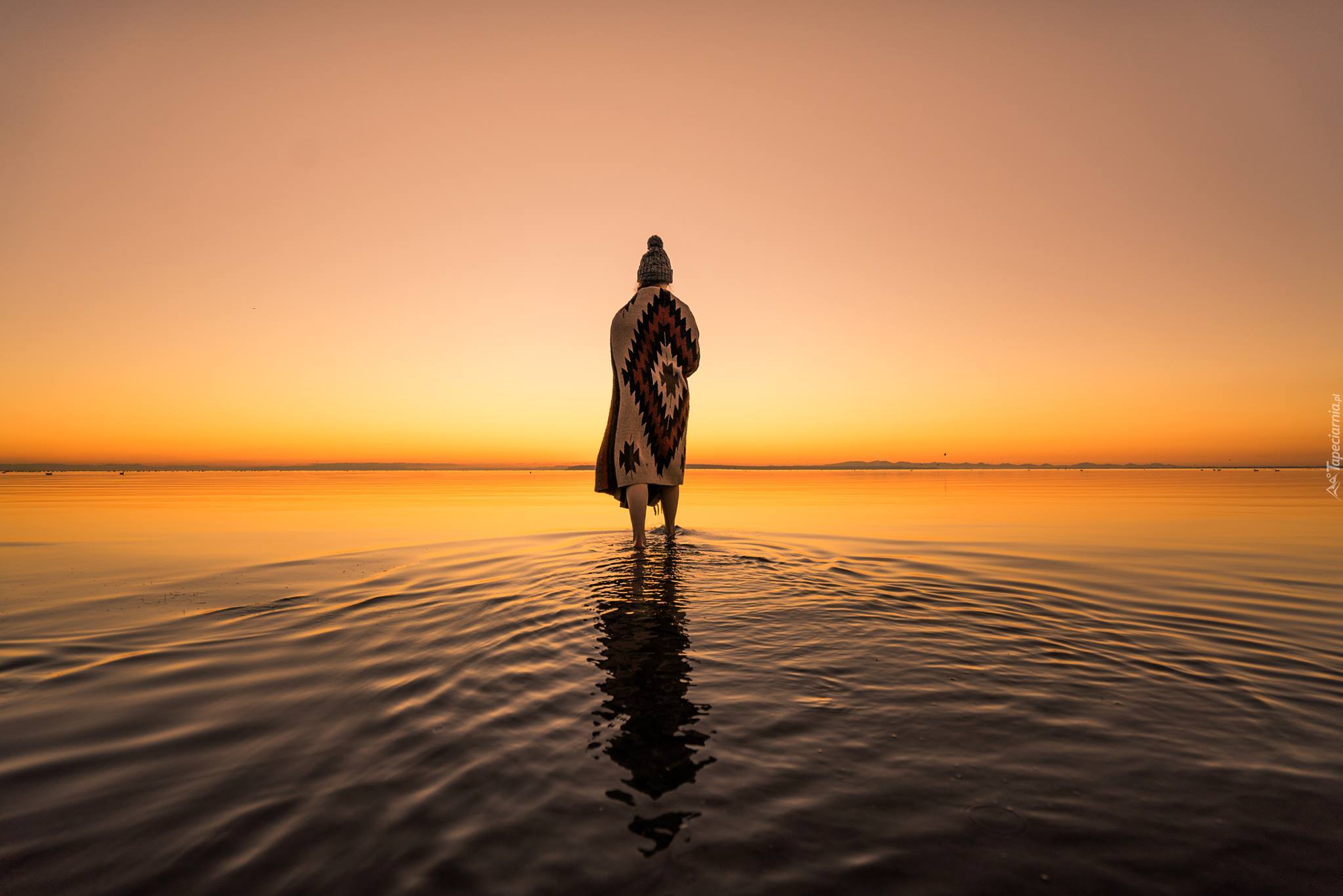 Edytor tapety: Kobieta nad zatoką w złocistym świetle zachodzącego słońca