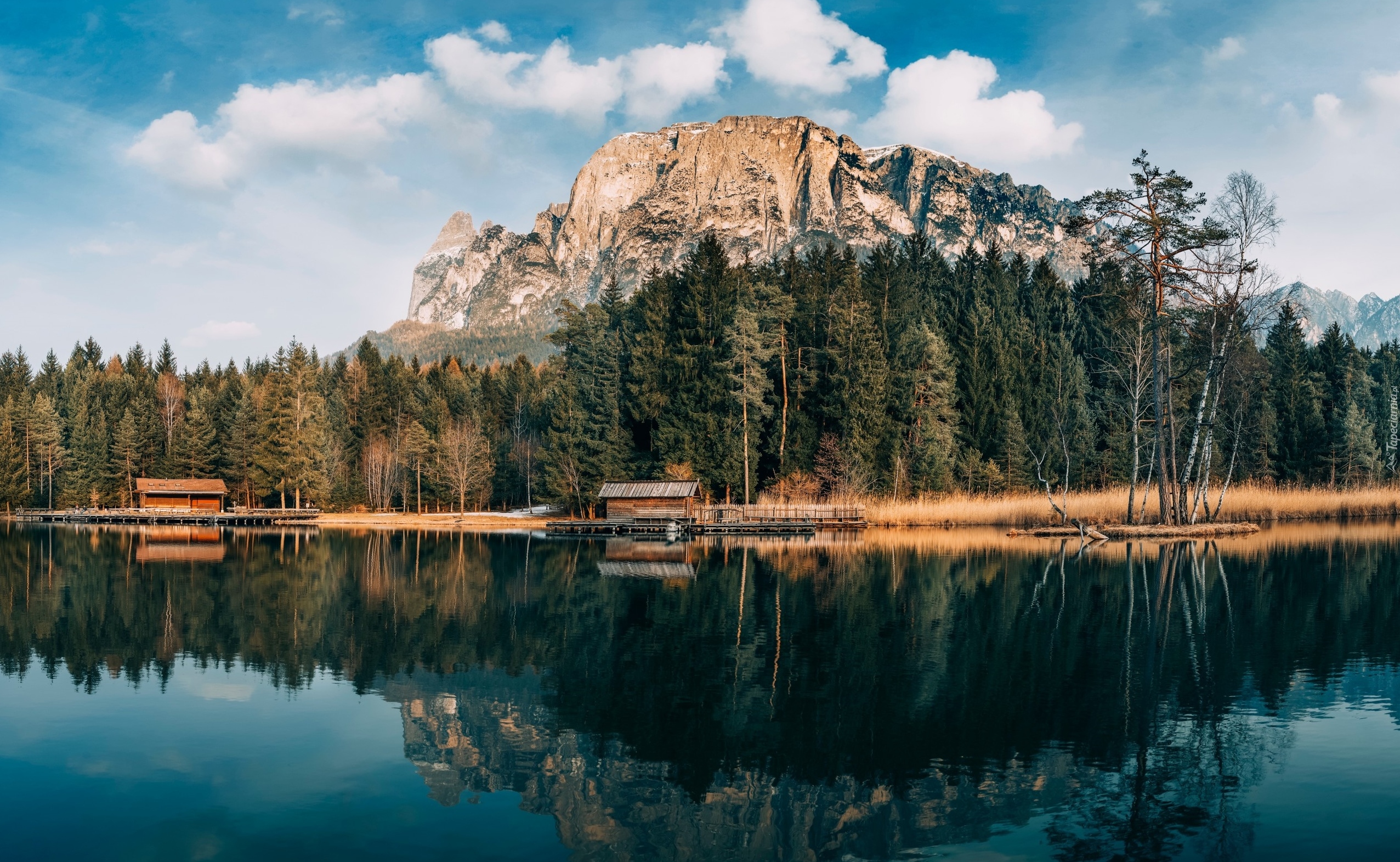 Edytor tapety: Drewniane chatki nad jeziorem w podgórskim lesie