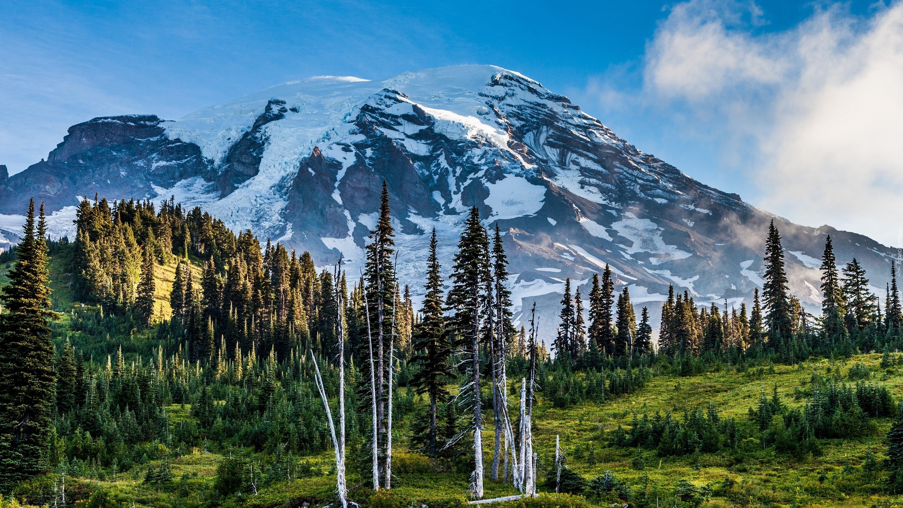 Edytor tapety: Ośnieżony masyw górski w otoczeniu drzew i roślinności