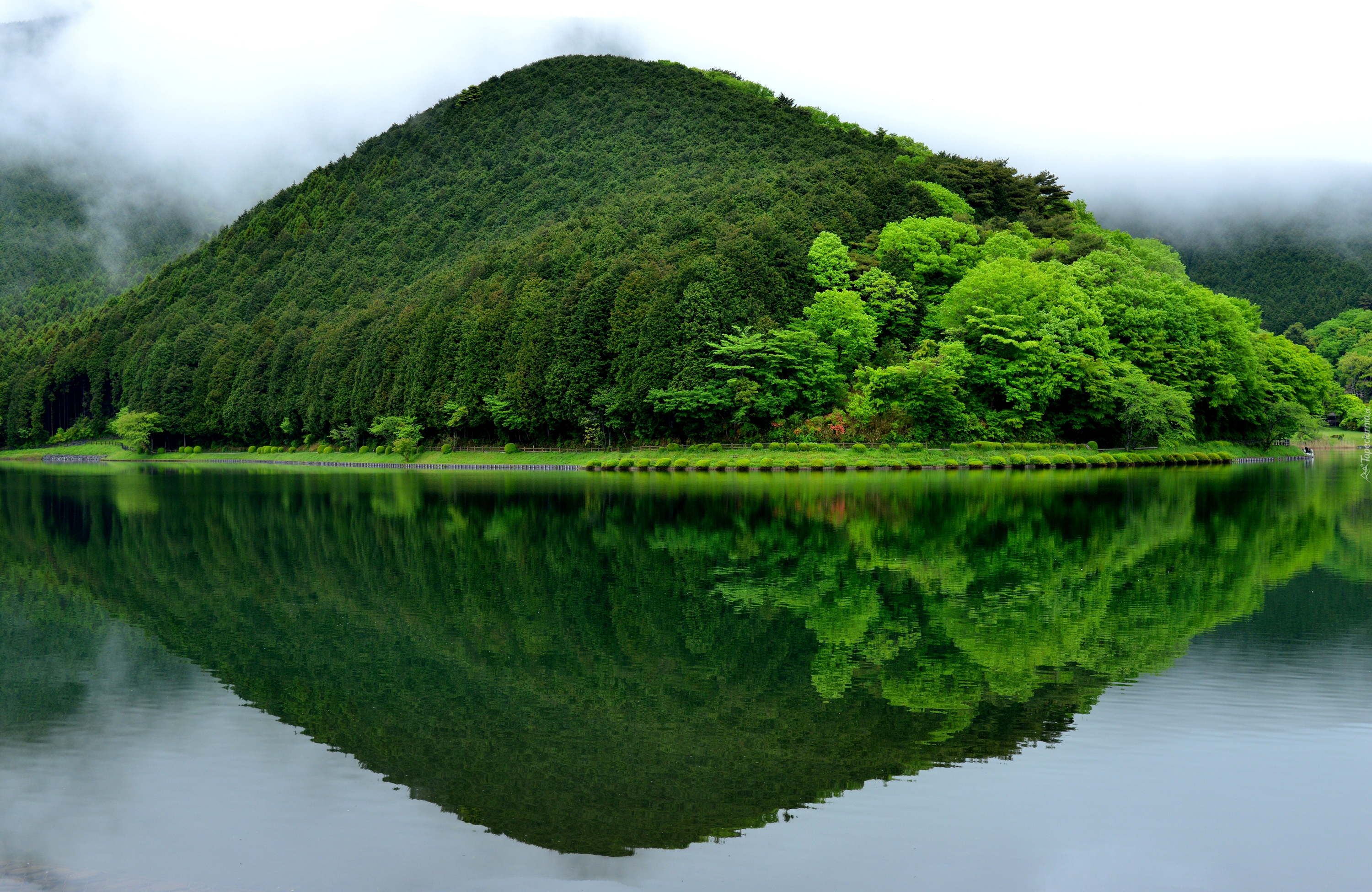 Edytor tapety: Zieleń odbijająca się w jeziorze Tanuki w Japonii