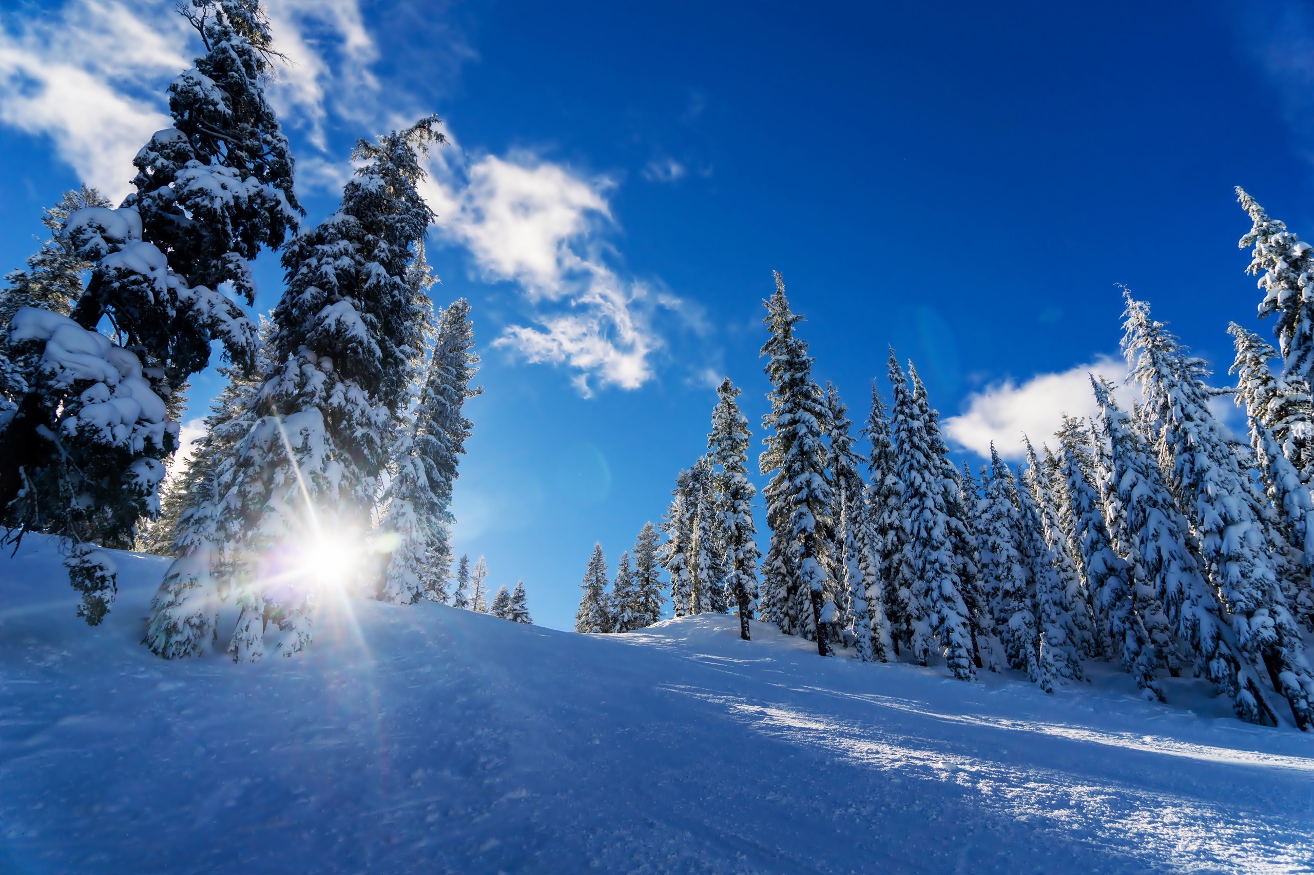 Edytor tapety: Promienie słońca wyzierające zza ośnieżonego drzewa w górach