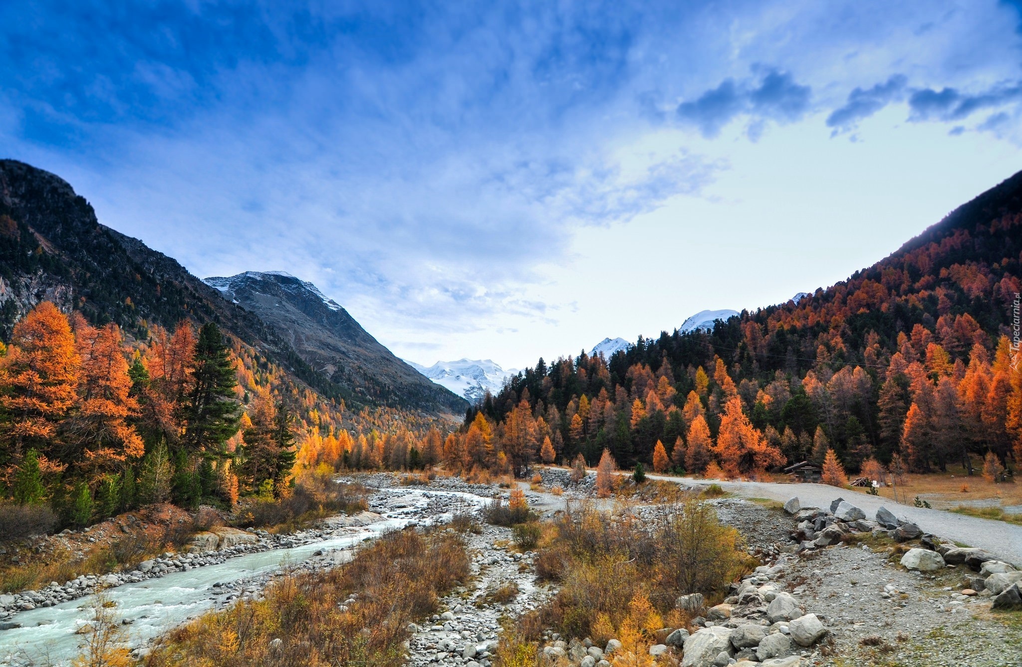 Edytor tapety: Górska kamienista droga prowadząca do lasu