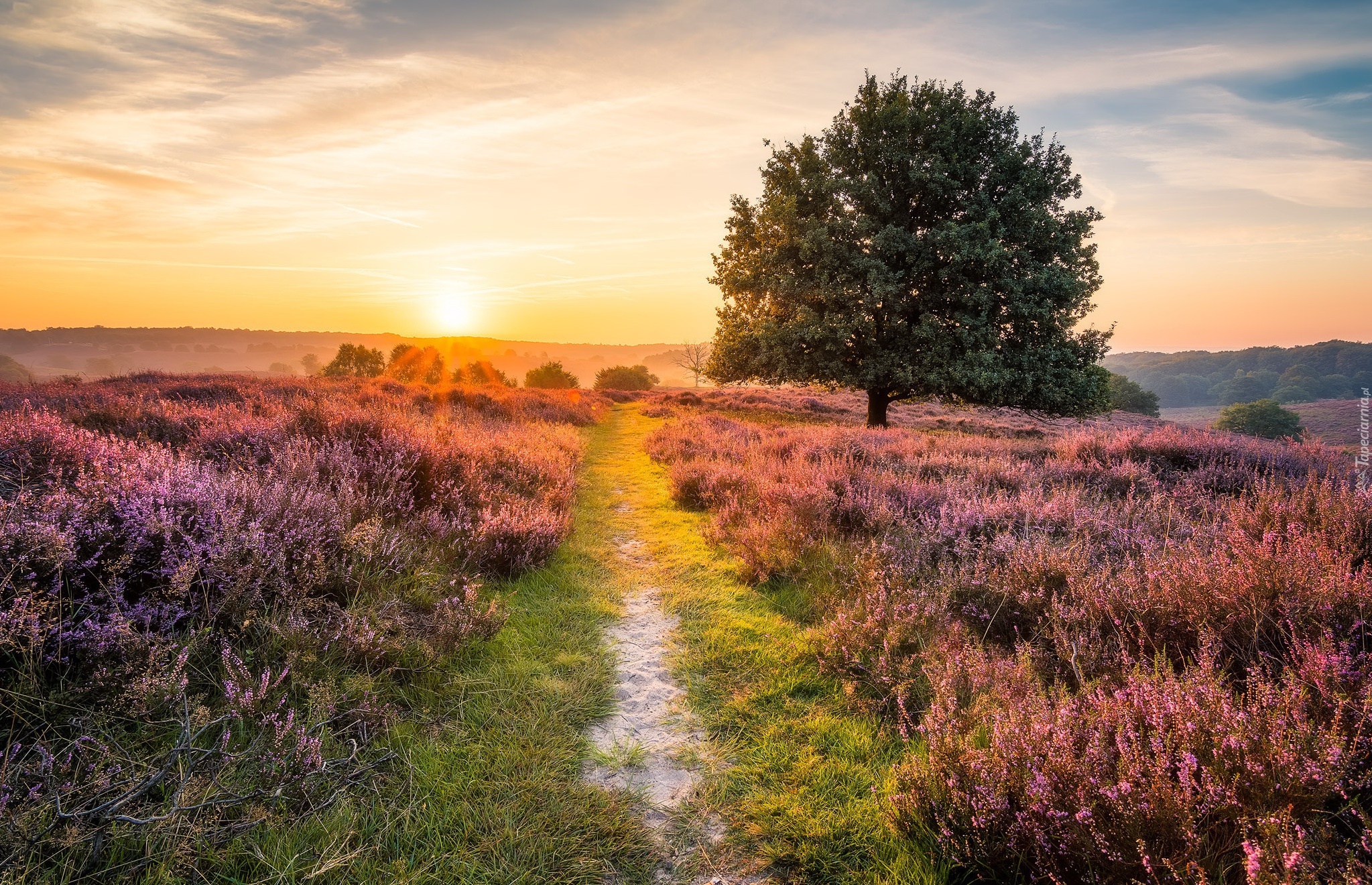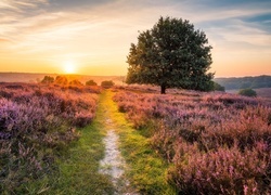 Edytor tapety: Droga przez wrzosowisko o wschodzie słońca