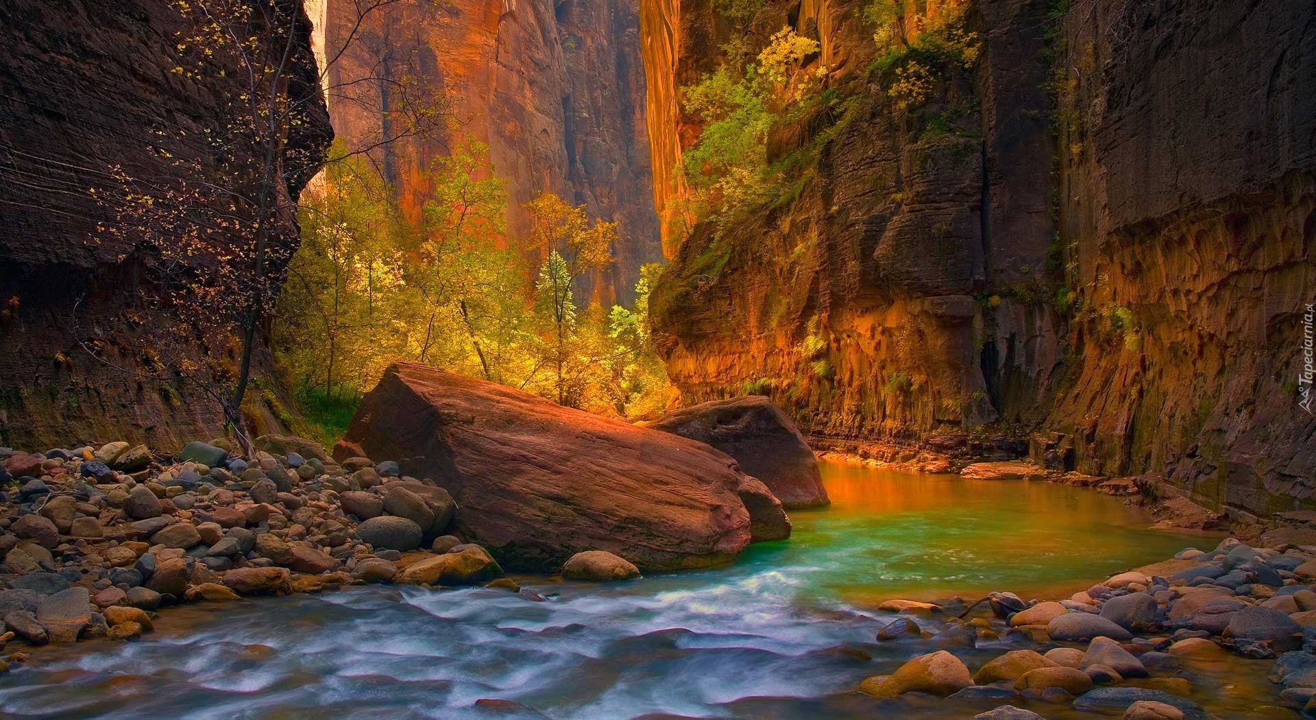 Edytor tapety: Rzeka i kamienie pośród skał