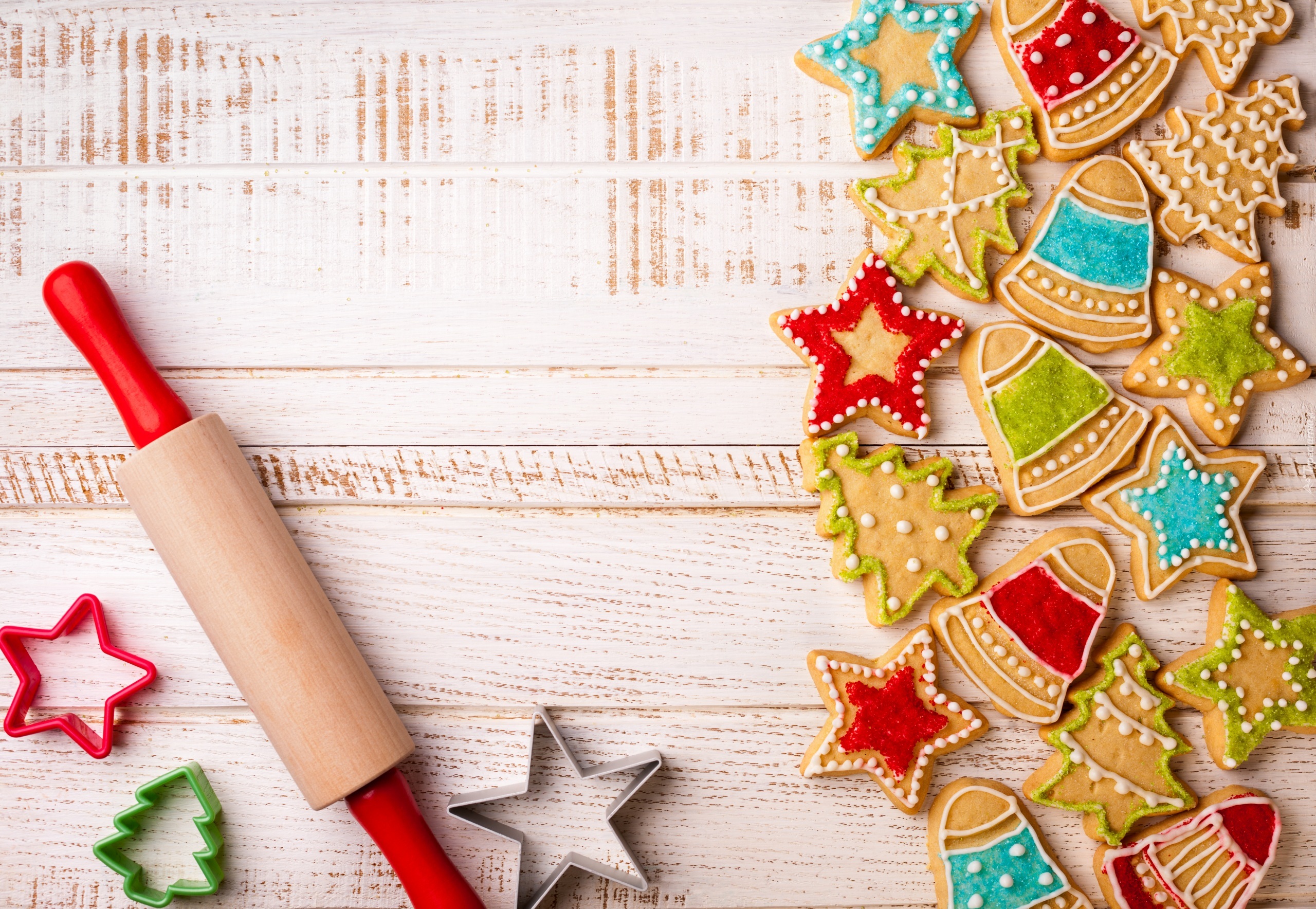 Edytor tapety: Świąteczne kolorowe ciasteczka obok wałka i foremek