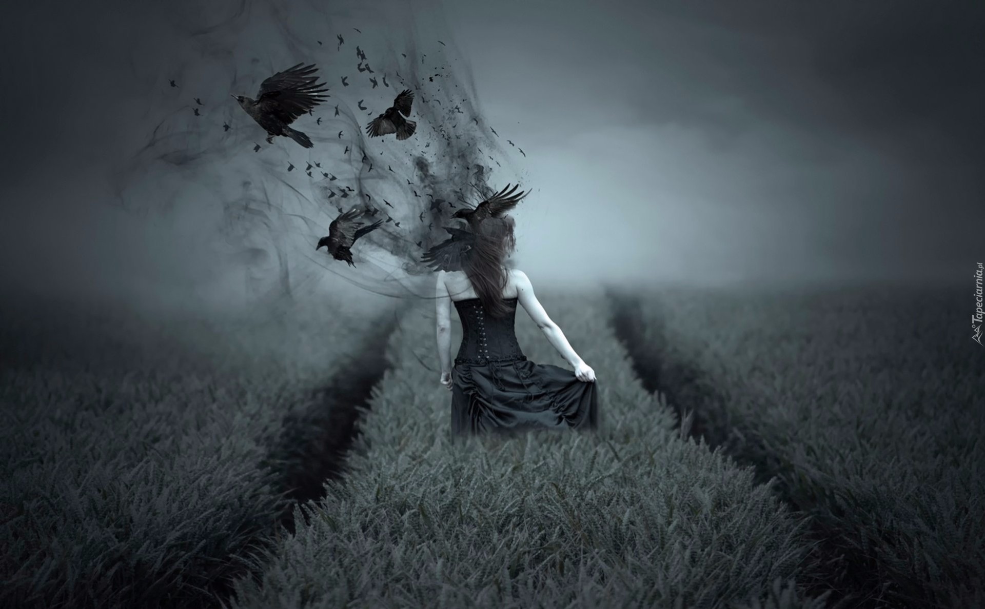 Edytor tapety: Kobieta w czarnej sukience buszująca w zbożu