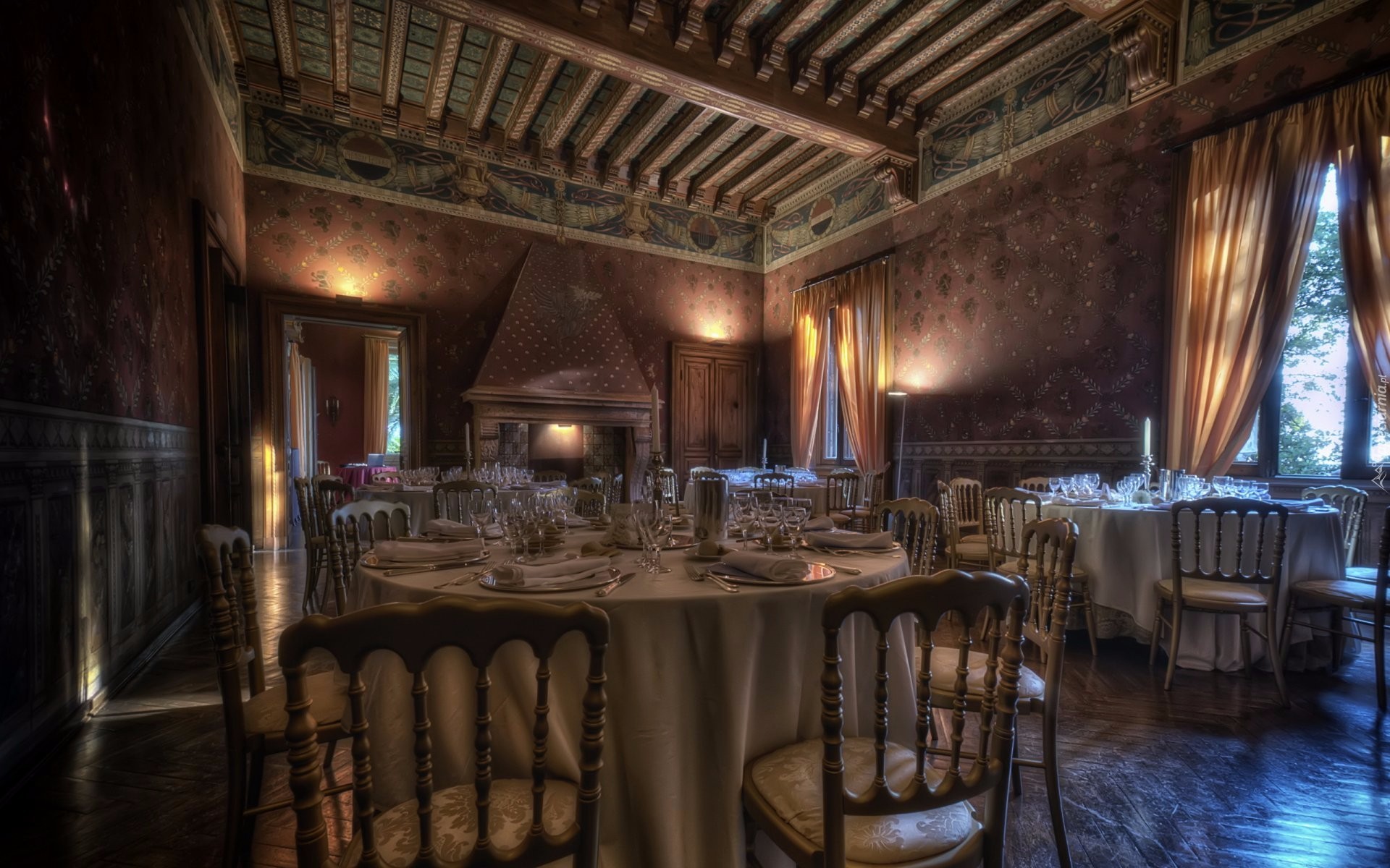 Edytor tapety: Sala restauracyjna z nakrytymi stołami