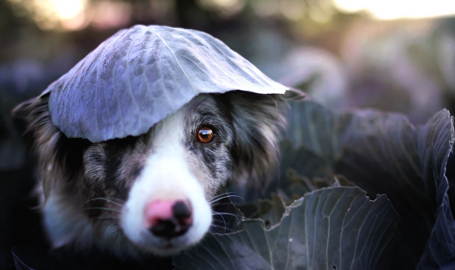 Edytor tapety: Pies border collie z liściem kapusty na głowie