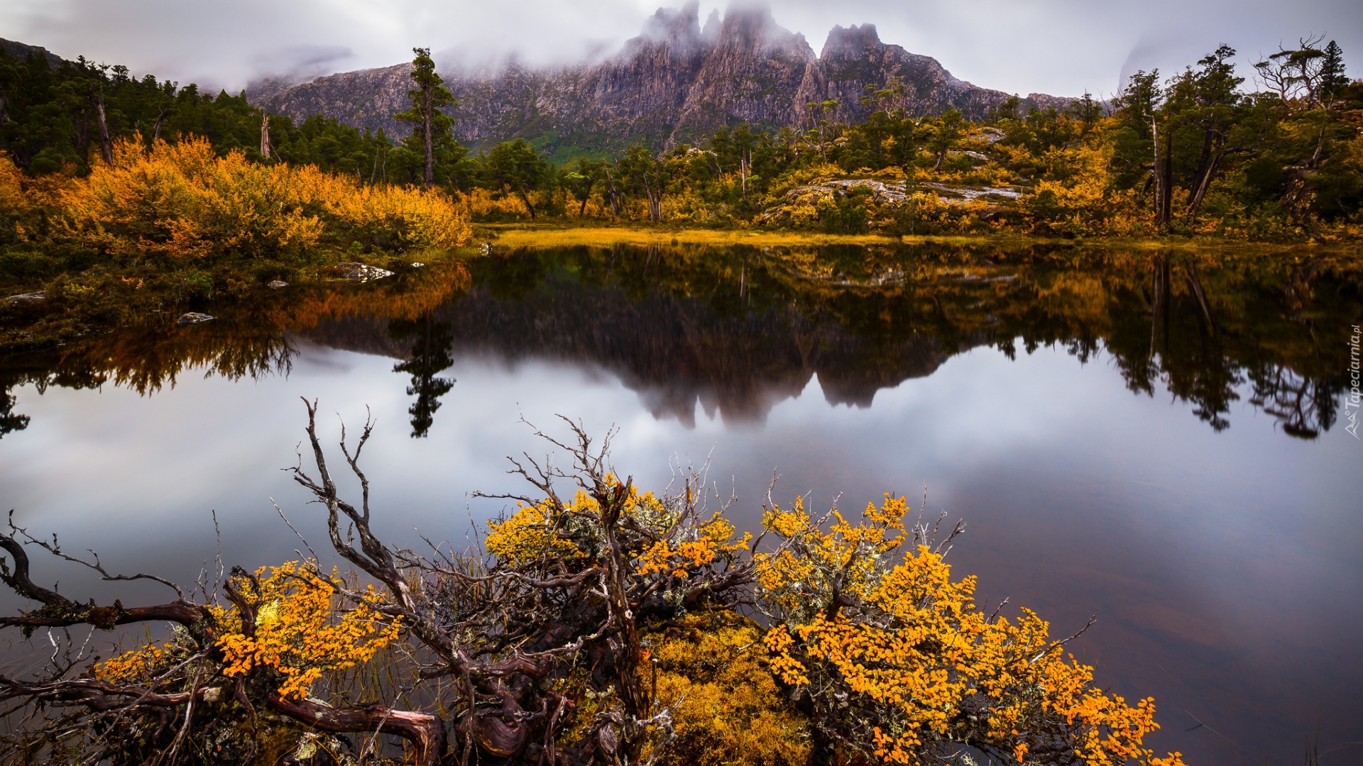 Edytor tapety: Drzewa nad jeziorem w jesiennych kolorach