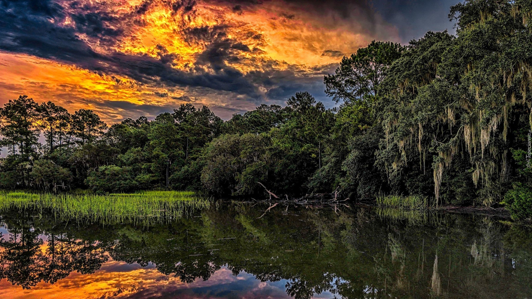 Edytor tapety: Drzewa w zachodzącym słońcu odbijają się w rzece