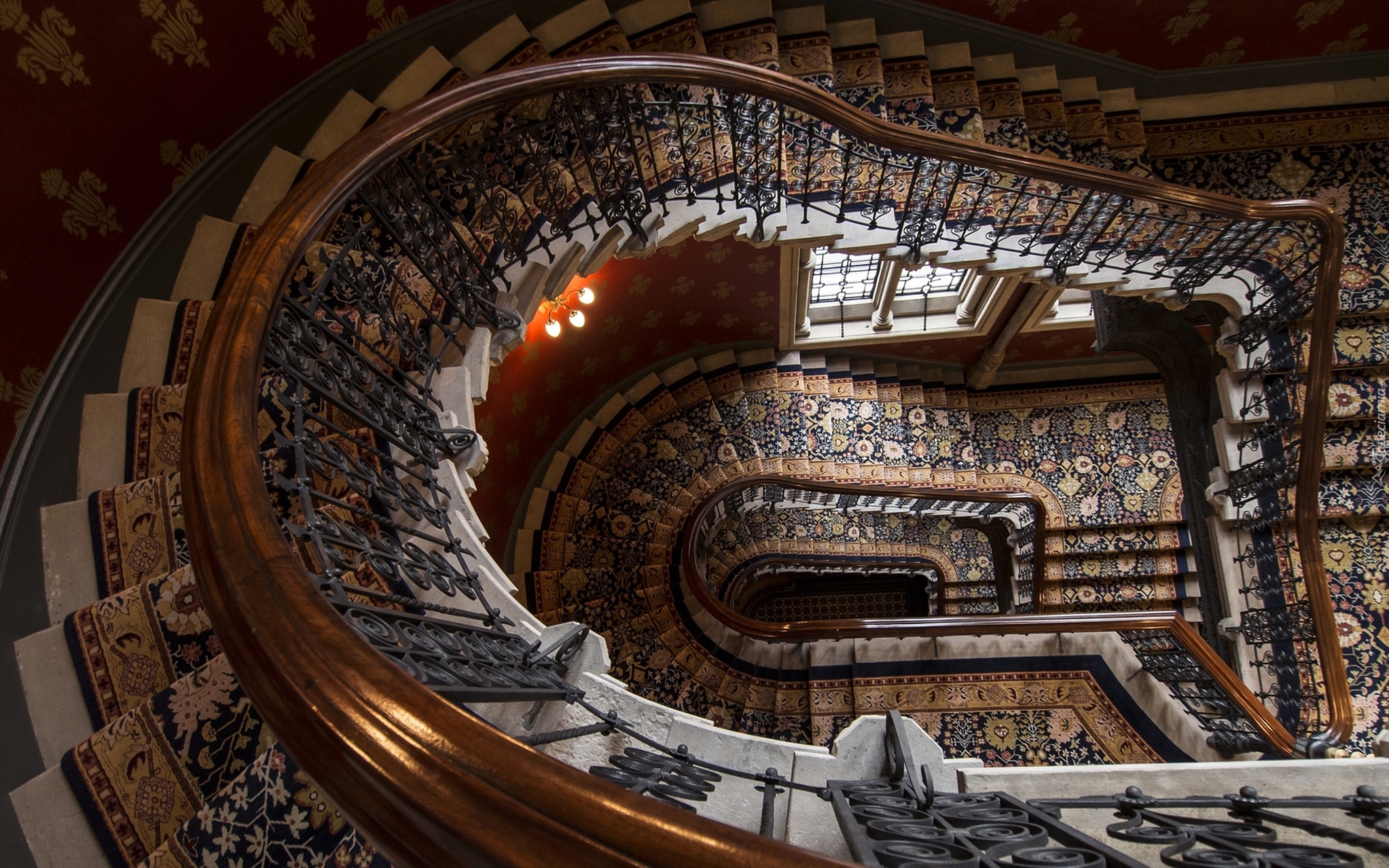 Edytor tapety: Klatka schodowa i kręte schody z metalową balustradą