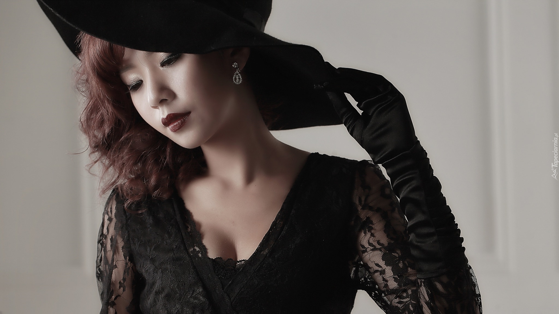 Edytor tapety: Kobieta w czarnym stroju i kapeluszu