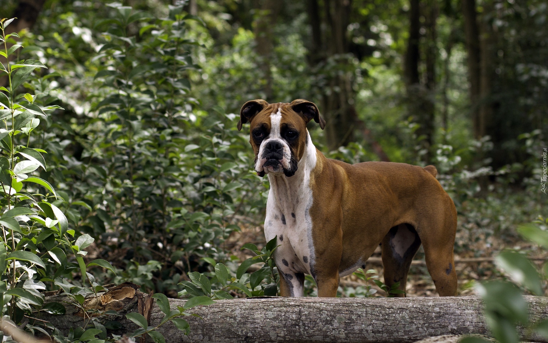 Edytor tapety: Pies bokser w lesie
