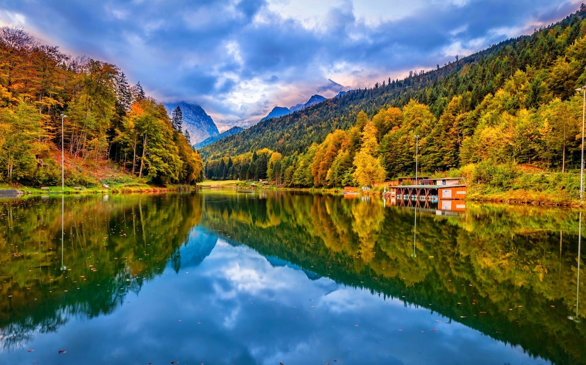 Edytor tapety: Złote jesienne drzewa odbijają się w górskim jeziorze