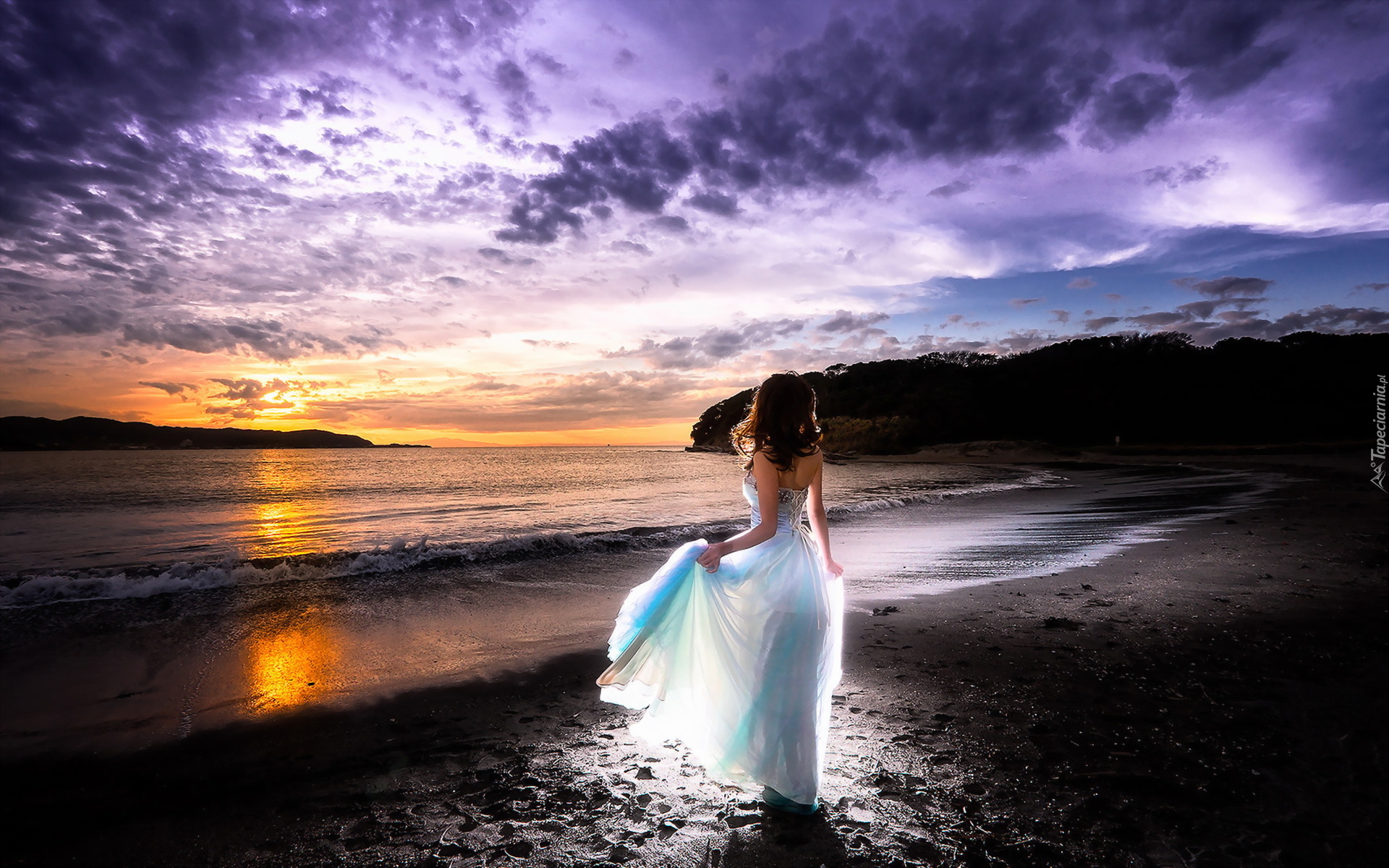 Edytor tapety: Kobieta nad morzem o zachodzie słońca
