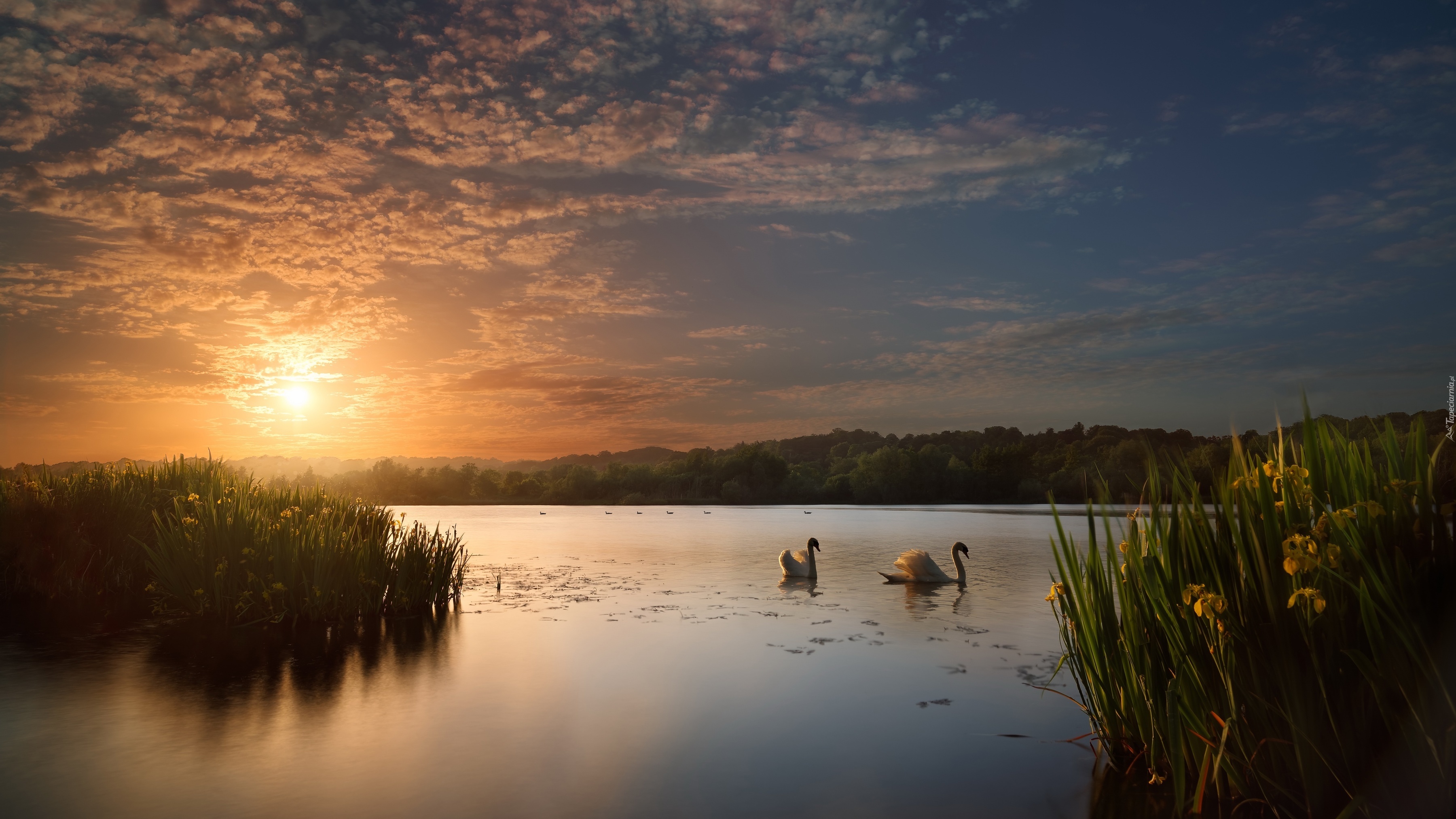 Edytor tapety: Łabędzie na jeziorze o zachodzie słońca
