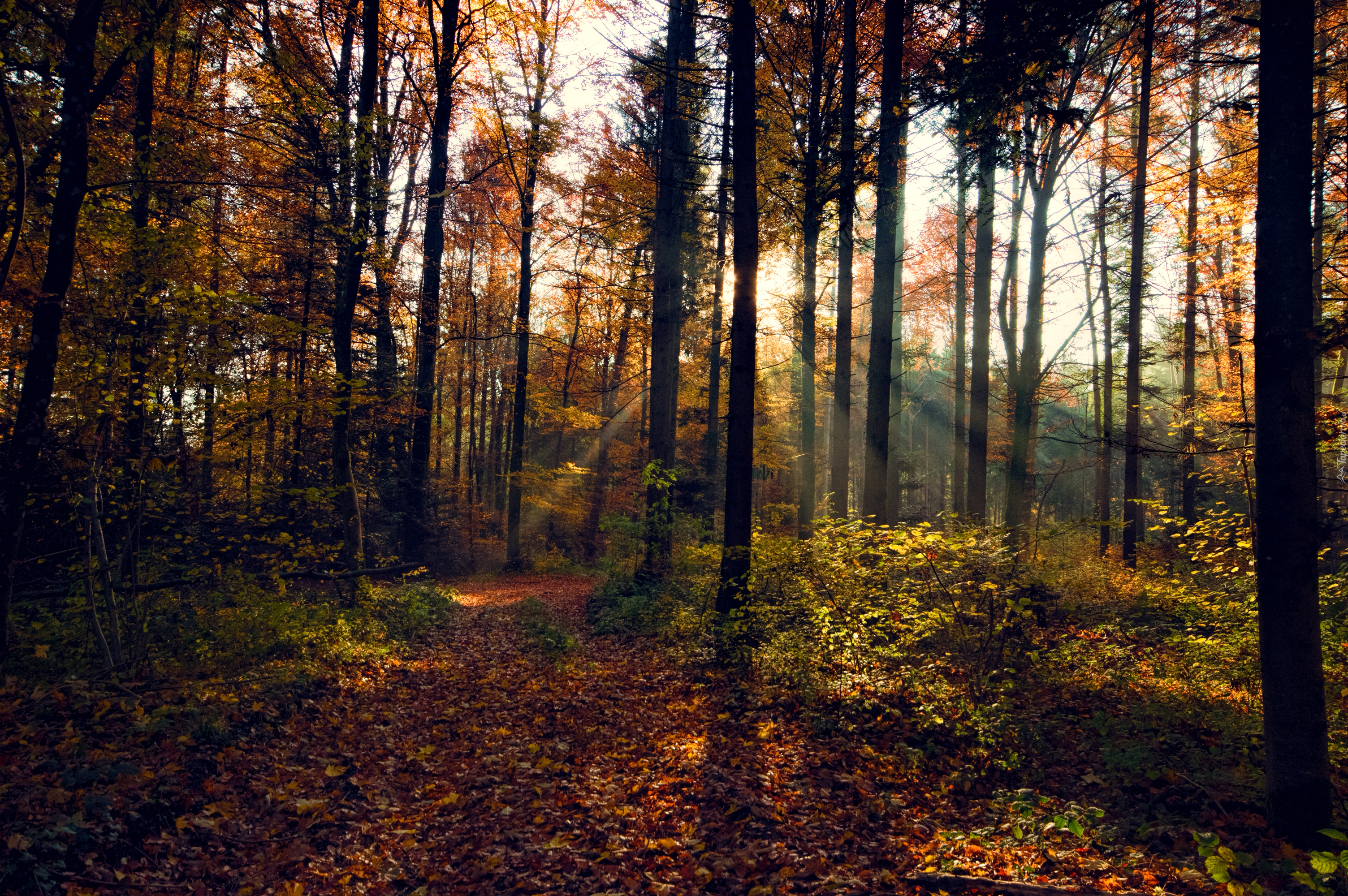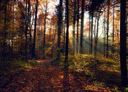 Edytor tapety: Promienie słońca oświetlają złoty jesienny las