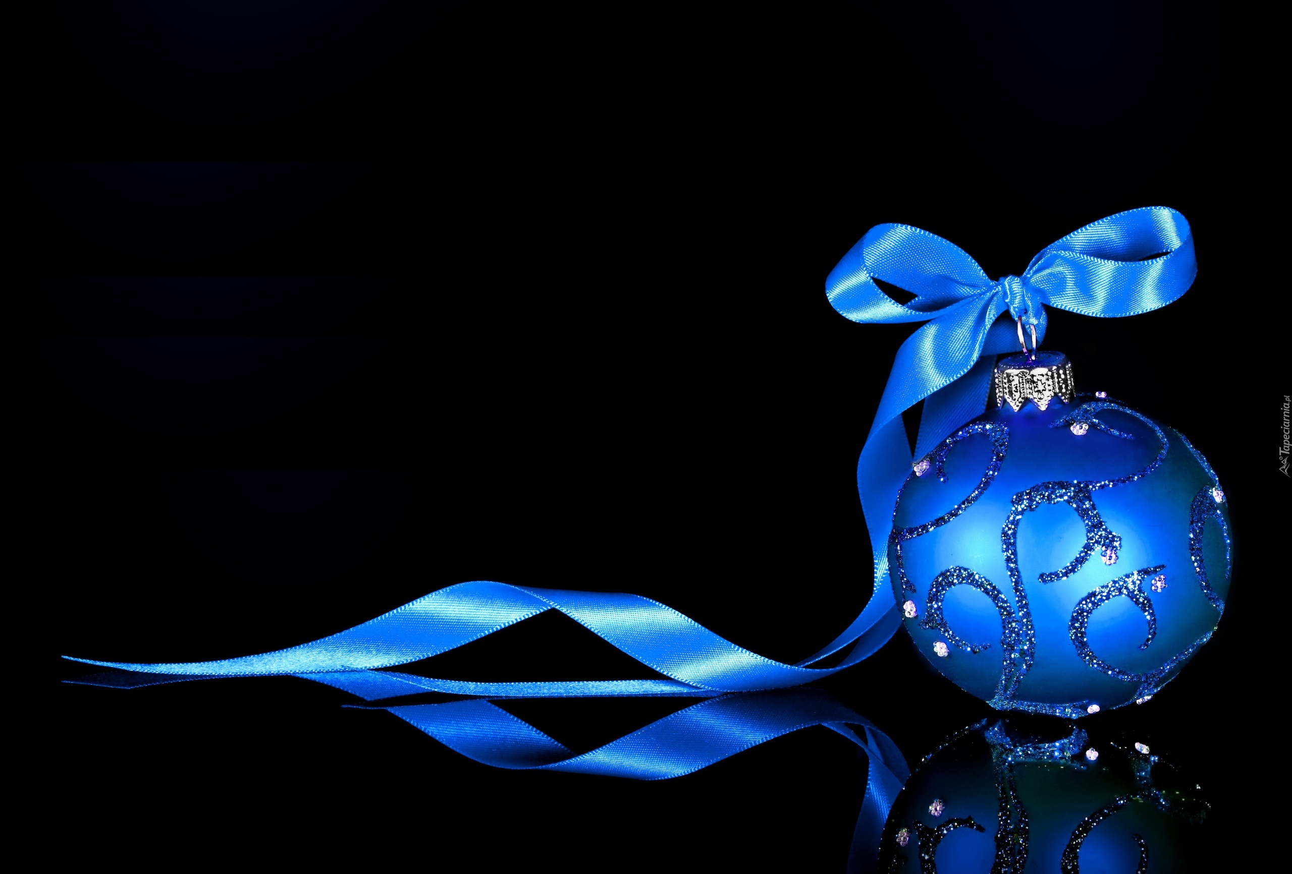 Edytor tapety: Niebieska bombka ze wstążką na czarnym tle