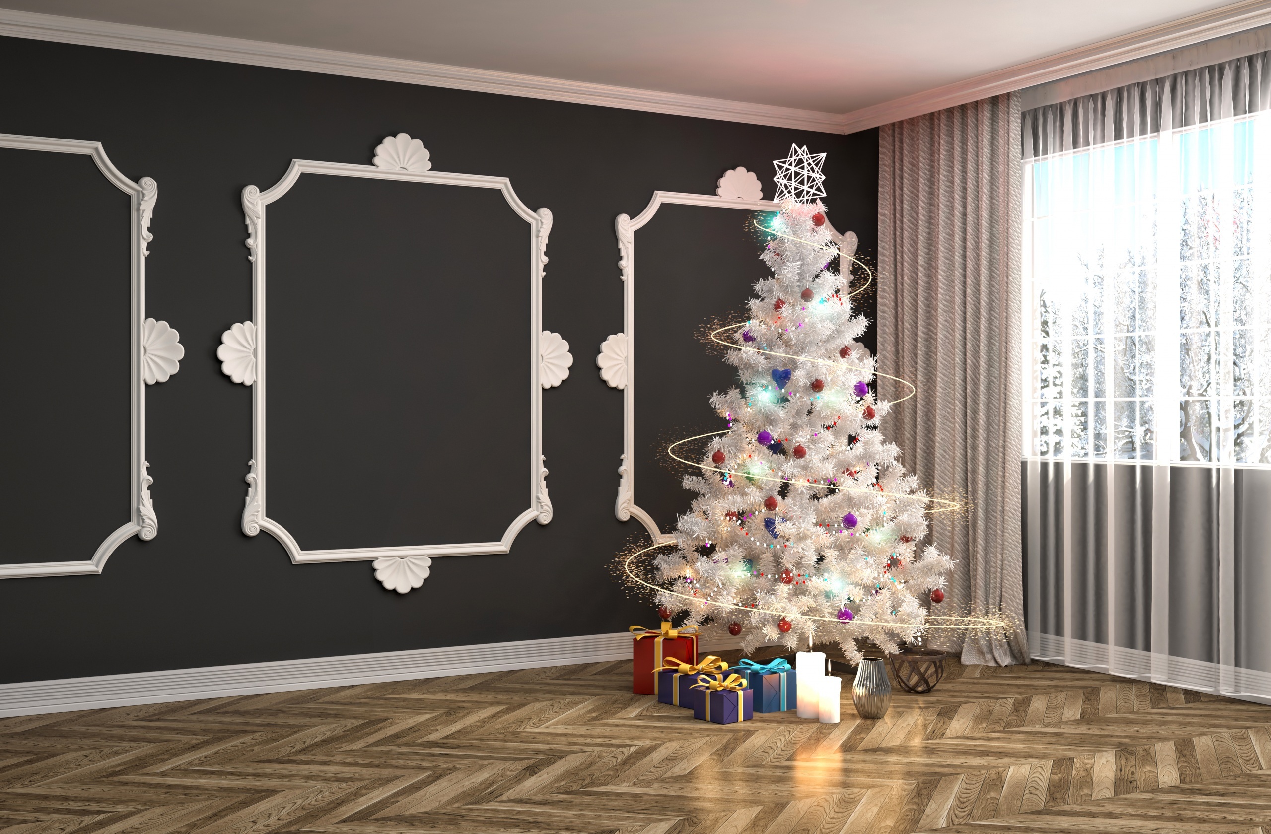Edytor tapety: Choinka z prezentami w dużym pustym salonie